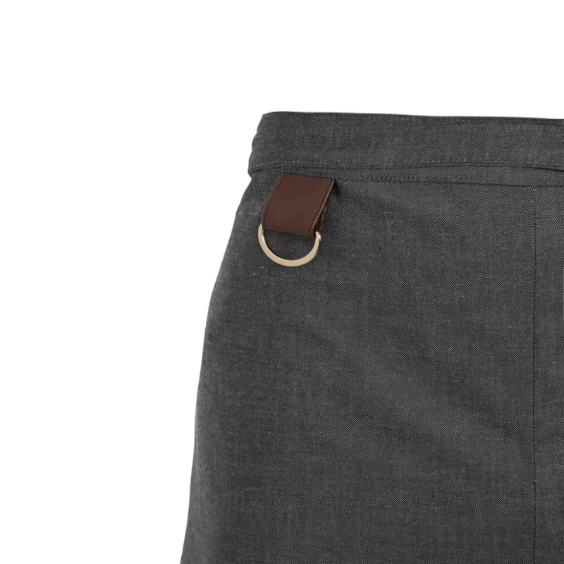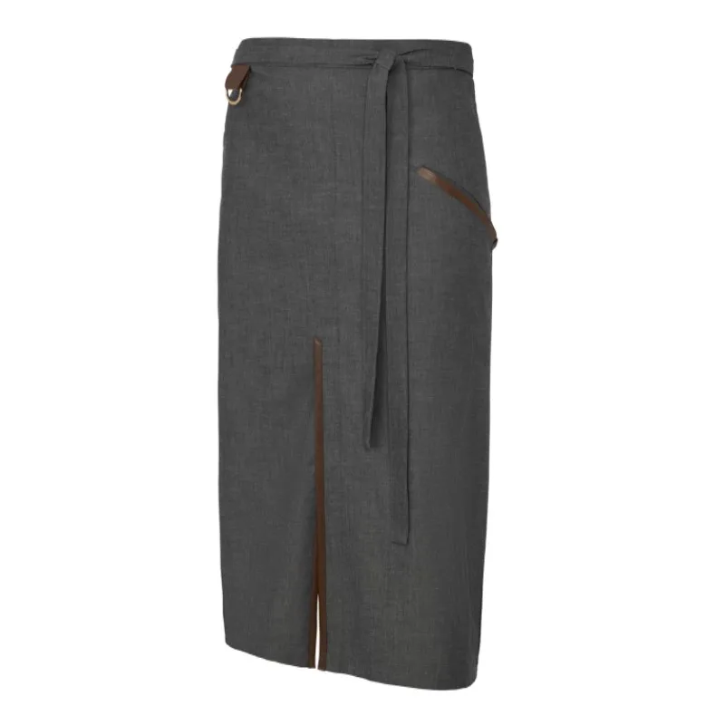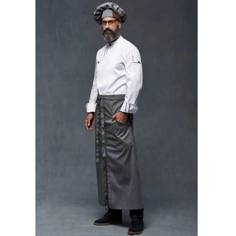 Avental de cozinha francês para homem . Apresenta uma abertura central destacada por um acabamento em couro sintético .