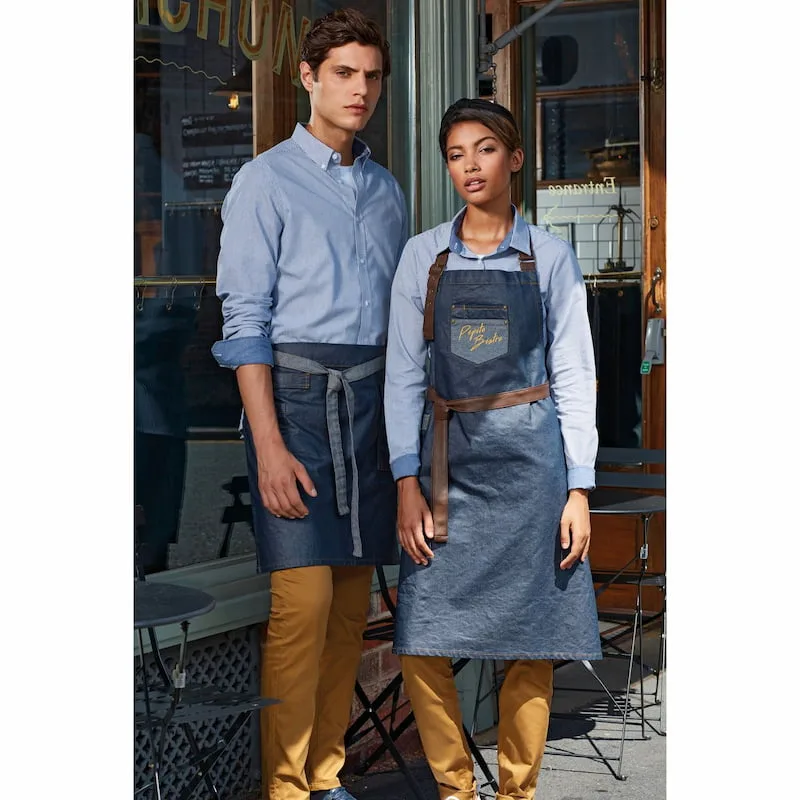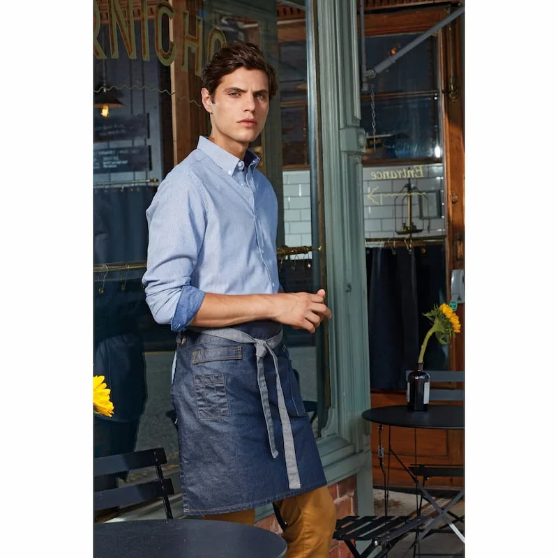 Avental semi curto com detalhes inspirados nas suas calças de ganga preferidas.