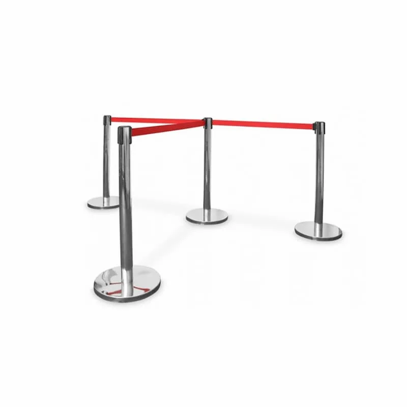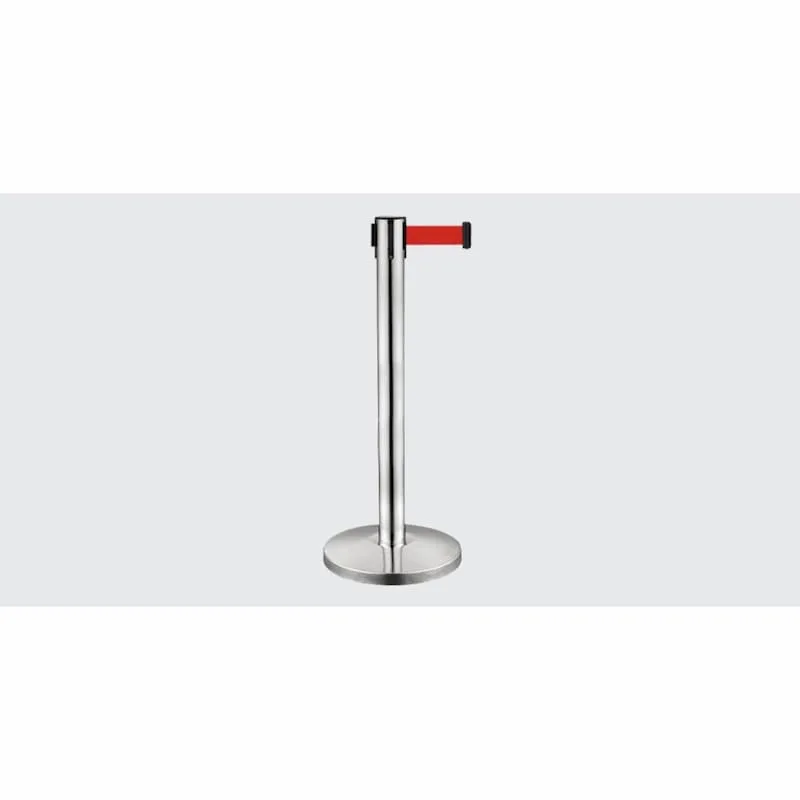 Barreira de delimitação em aço inoxidável cromado, com 1 fita para delimitação de filas de espera, utilizada em aeroportos, bancos, hotéis, cinemas, museus, entre diversas aplicações.