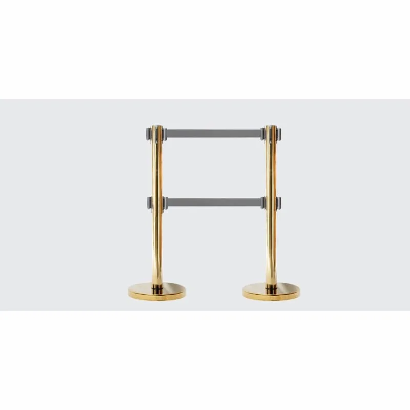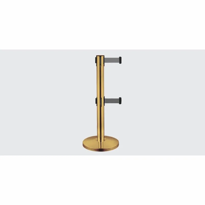 Barreira de delimitação em aço inoxidável dourado, com 2 fitas para delimitação de filas de espera, utilizada em aeroportos, bancos, hotéis, cinemas, museus, entre diversas aplicações.
