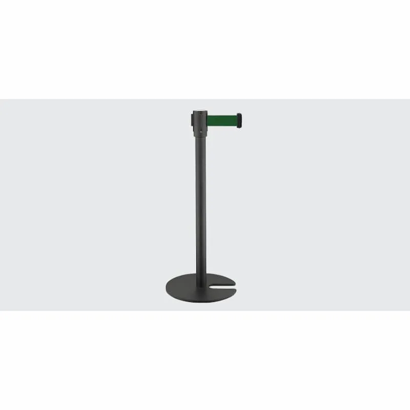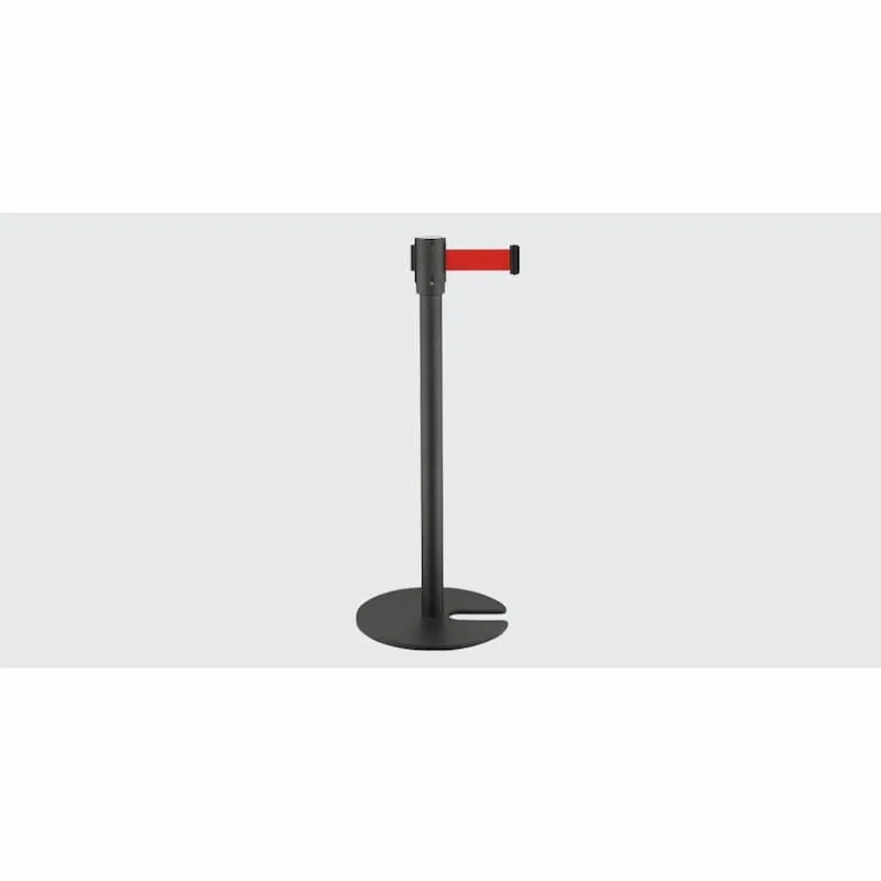 Barreira de delimitação em aço inoxidável preto, com 1 fita para delimitação de filas de espera, utilizada em aeroportos, bancos, hotéis, cinemas, museus, entre diversas aplicações.