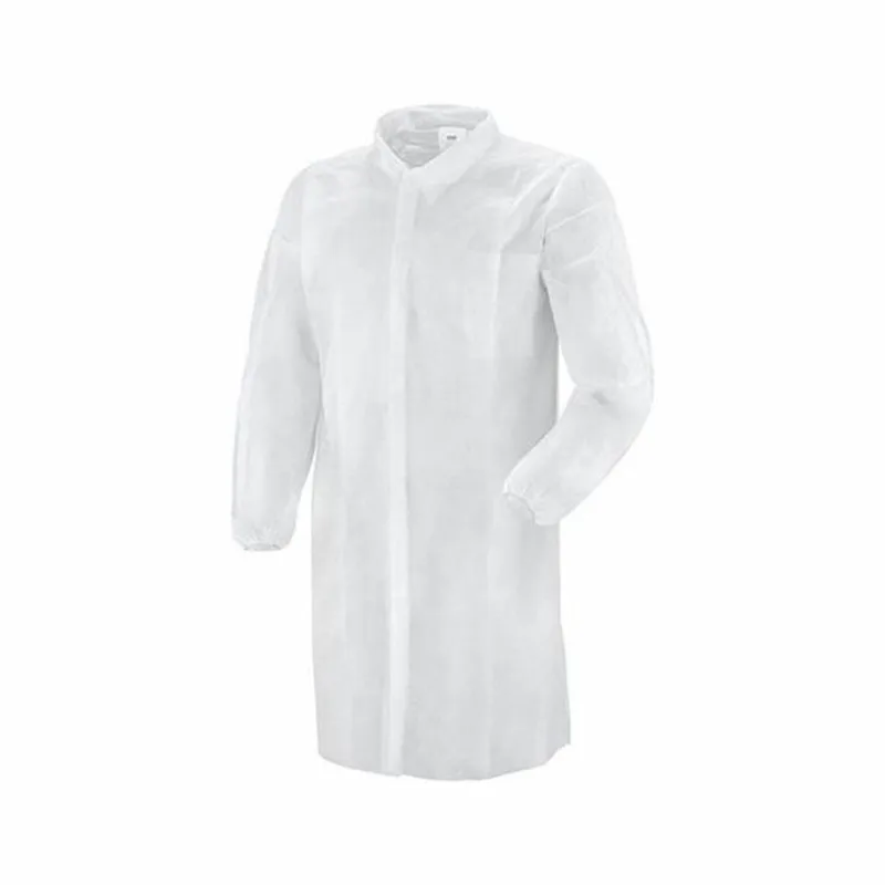 Bata de proteção, descartável, em “tecido não tecido”, com elástico no pulso e fecho de velcro frontal. Caixa de 50 peças embalada em sacos individuais.