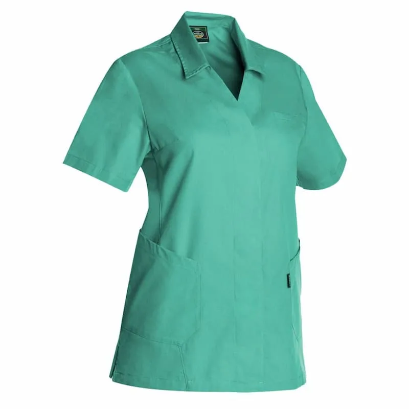 Blusa feminina de manga curta com decote em V, três bolsas, abertura central oculta.
