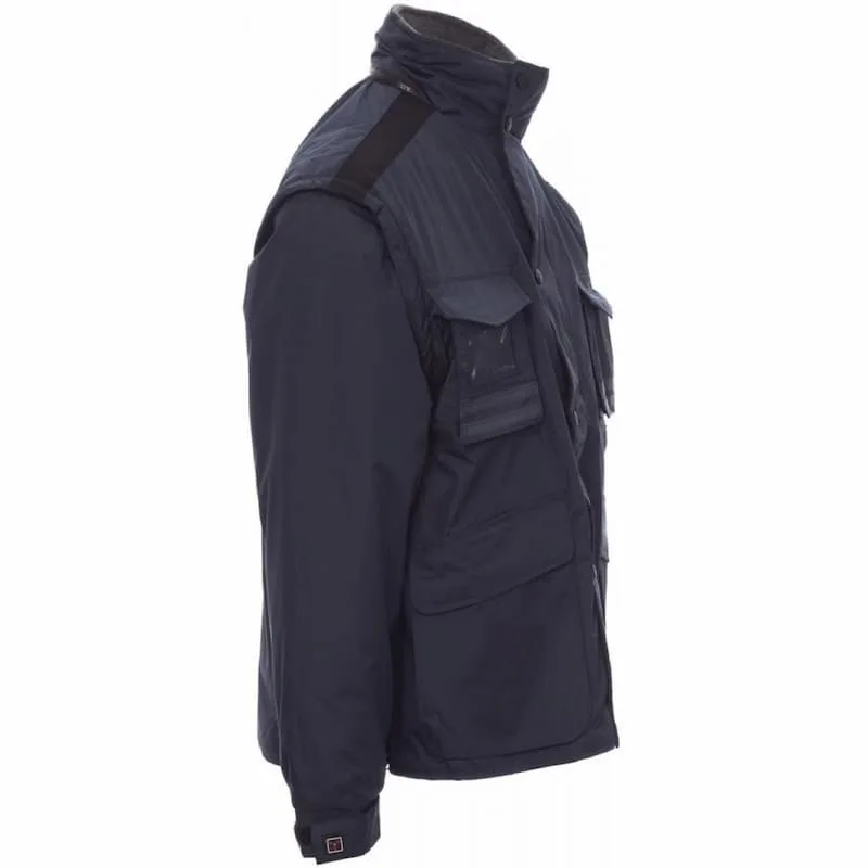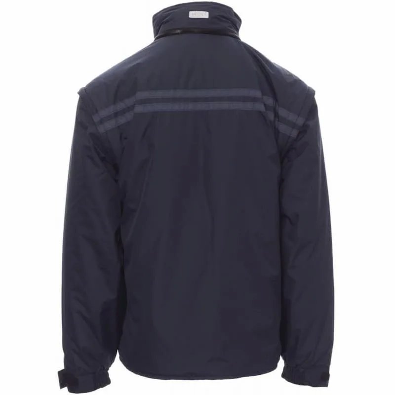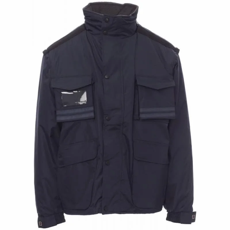 Blusão de homem, mangas destacáveis, fecho de correr de 8 mm de plástico e com cursor de metal, com paleta e botões em plástico, capuz oculto na gola, punhos ajustáveis, faixas refletoras na mesma cor na frente e costas, respiradouro lateral com reforço e fecho de correr, cinco bolsos exteriores das quais uma com porta-identificação reversível.