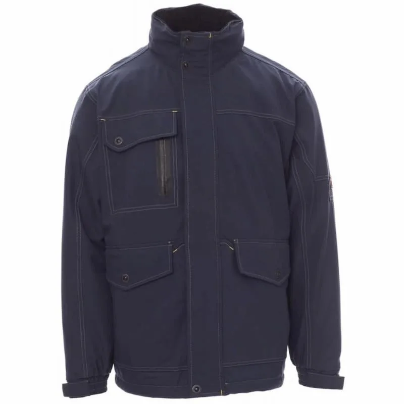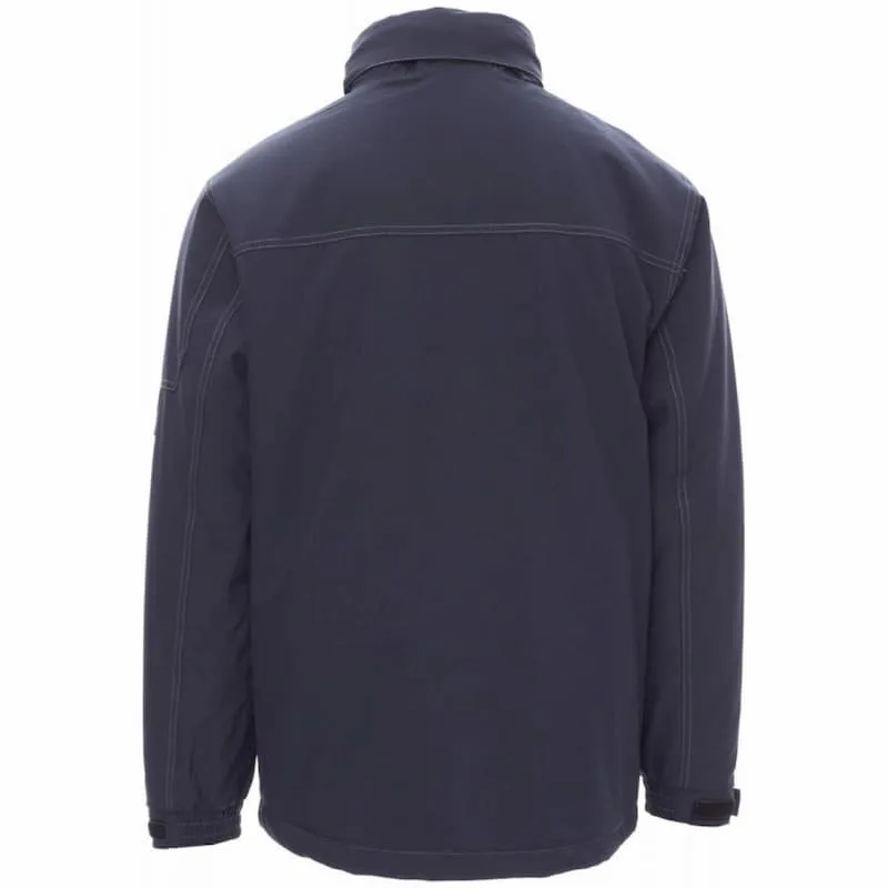 Blusão de homem, fecho de correr de 8 mm e paleta com velcro, tecido respirável e técnico, costuras soldadas termicamente, capuz oculto na gola, punhos ajustáveis, 4 bolsos dianteiros espaçosos, dos quais 2 com paleta e fecho de corre, dois bolsos no peito com fecho de correr com aba de proteção, botões de mola em metal, costura contrastante prateado/cinzento. Interior: polar de poliéster, acolchoado.