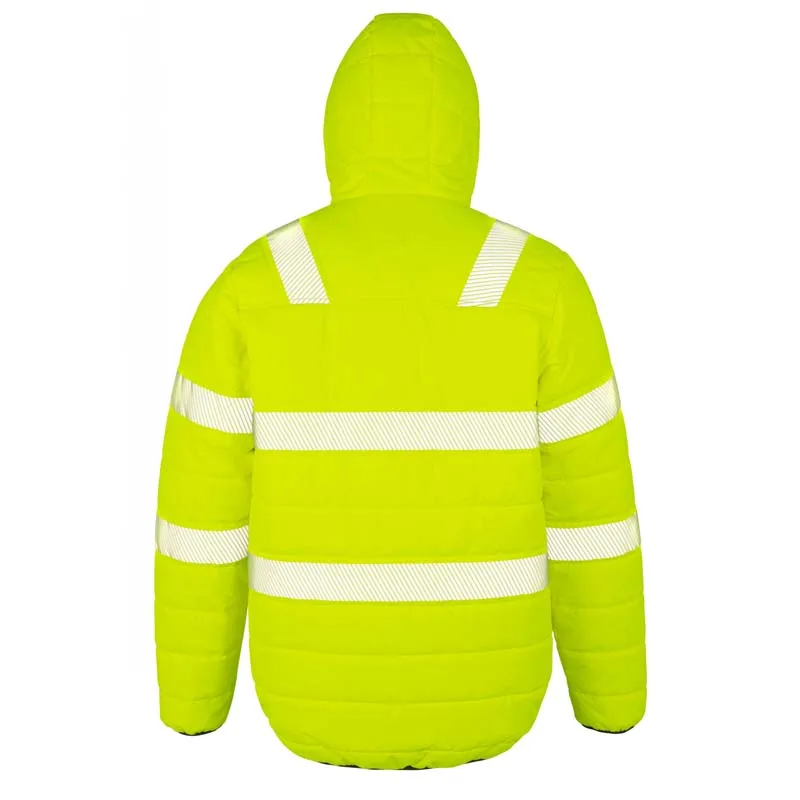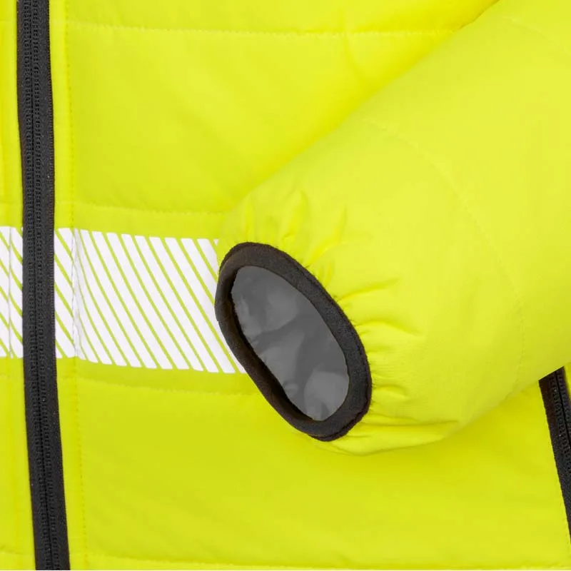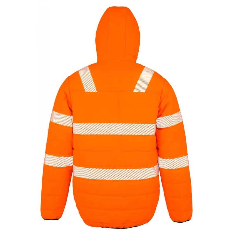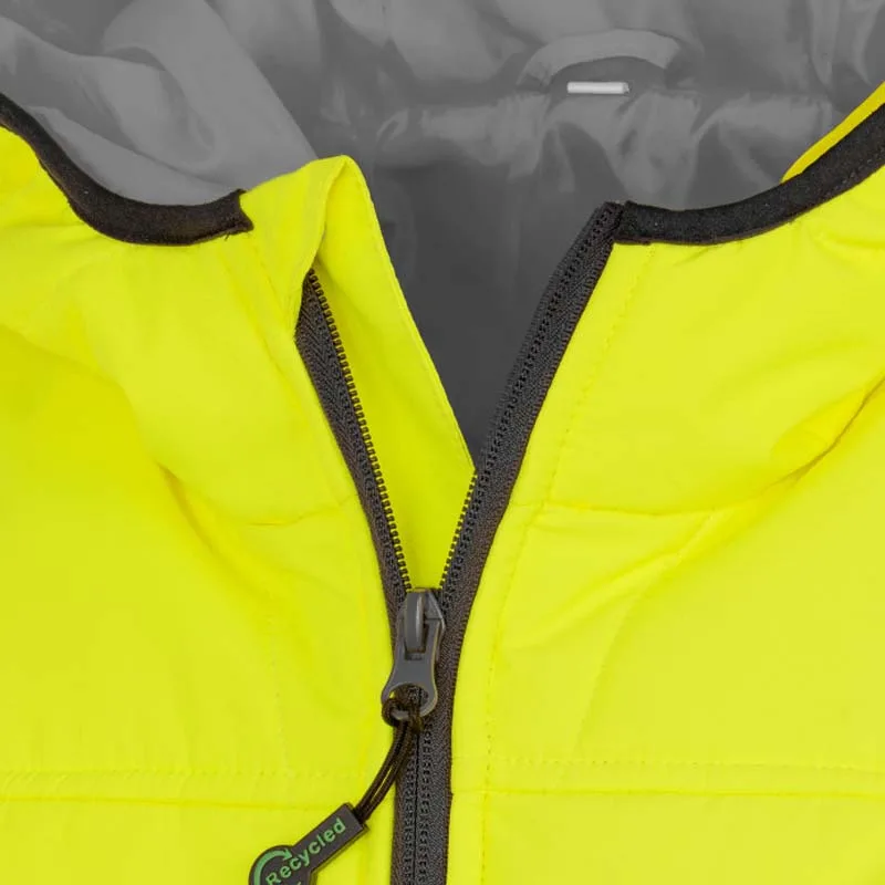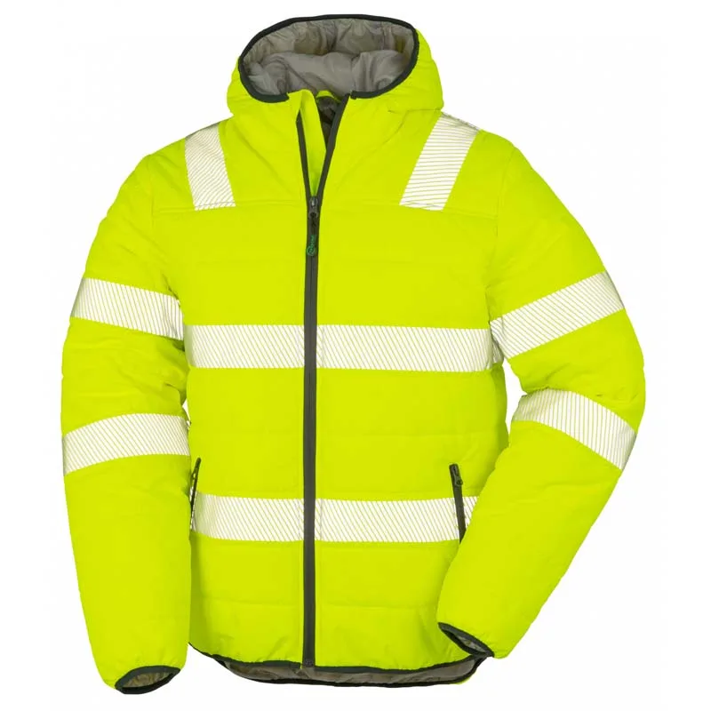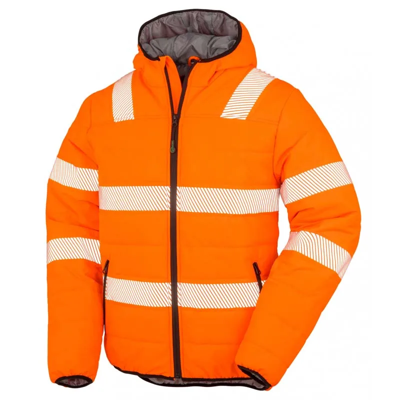 100% poliéster. 100% poliéster reciclado. Exterior em TPU reciclado anti rasgos. Resistente à abrasão com REPREVE®. Enchimento em poliéster reciclado 200 g/m² REPREVE®. Fibras recicladas fabricadas a partir de garrafas de plástico. Com fecho YKK com protecção para o queixo e tira. Cós, punhos e capuz com acabamento elástico. Mais comprido nas costas. Faixas reflectoras impressas no corpo, nos ombros e nas mangas. Bolsos laterais com fecho. Capuz acolchoado. Bolso interior. Presilha para pendurar. Norma High Viz: EN ISO 20471: 2013+A1: 2016 Classe 2 RIS-3279-TOM Classe 2 (somente no modelo Laranja)