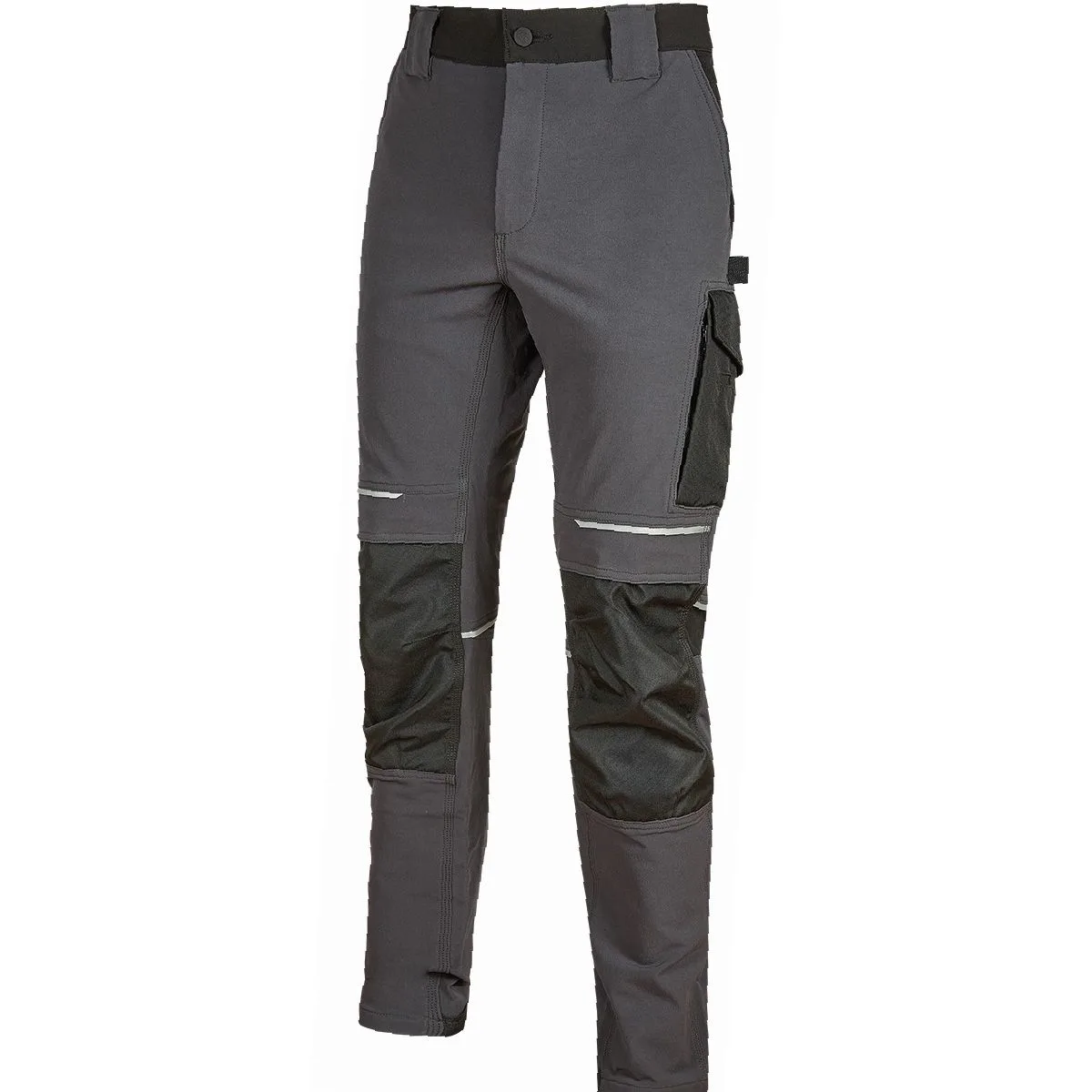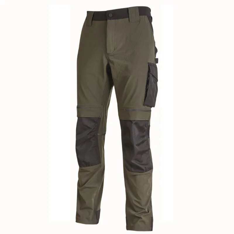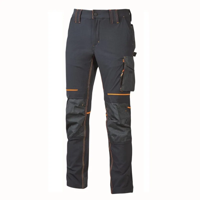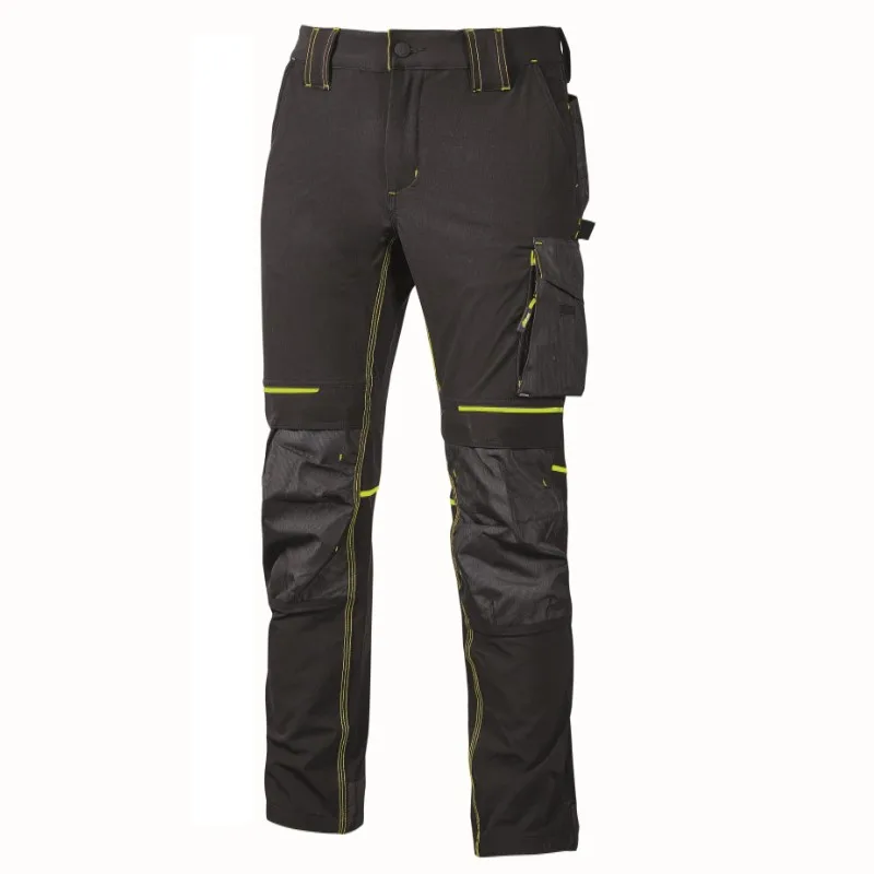 Calça em tecido U-4 (U-Power 4 way stretch), muito confortável, durável, suave na pele, repelente de água, respirável e de secagem rápida. Equipado com dois grandes bolsos frontais, cintura elástica com um inovador sistema de ajuste retrátil. Garfo traseiro acentuado para maior proteção da região lombar e fita reflexiva na alça traseira do cinto. Bolso lateral para ferramentas, bolso lateral multifuncional com porta-crachá oculto, dois bolsos traseiros, um com aba e outro com fecho de segurança com velcro, dois bolsos no joelho de fácil entrada e fecho na bainha, todos em polyoxford 600D resistente. Dois bolsos com fecho; bolso lateral e bolso frontal direito. Costura tripla. Mosqueta central com fecho YKK e botão anti riscos, Slim Fit.