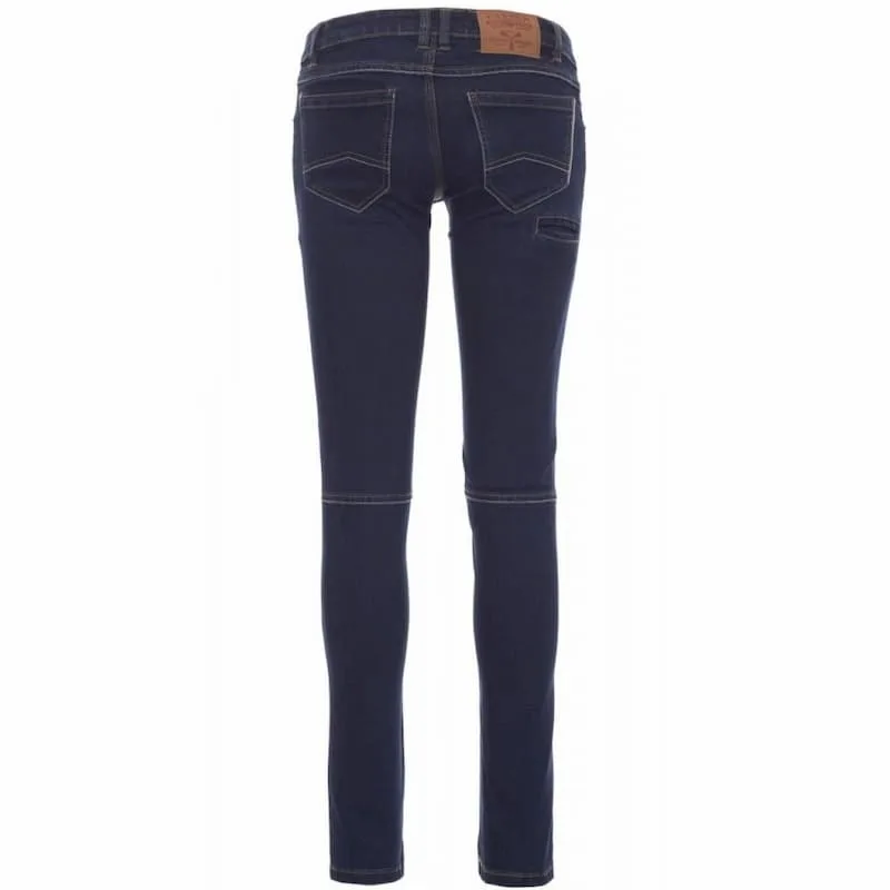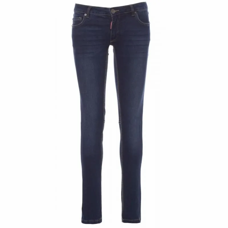 Calças de ganga de senhora, com cinco bolsos, fecho de correr em metal e botão, cós com presilhas, 1 bolso para metro, 1 pequeno bolso para canetas e X-ato, tratamento stone wash, efeito desgastado e délavé, perna afunilada, costuras com linha grossa em contraste e com agulha tripla na parte interior das pernas.