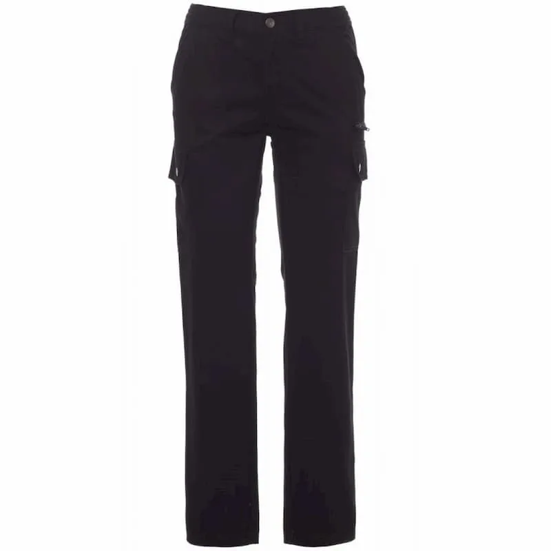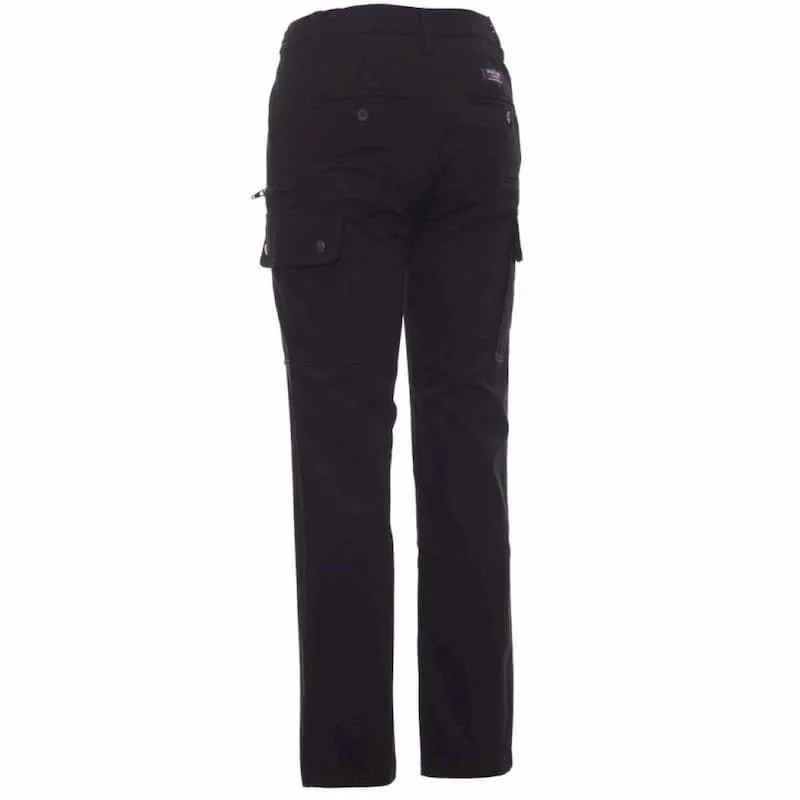 Fecho de correr com botão metálico, dois bolsos dianteiros, dois bolsos laterais com abas e fechos tipo snap, um bolso de correr lateral, um bolso de fita métrica rebatível à direita, dois bolsos traseiros com ranhura, com botão e casa.