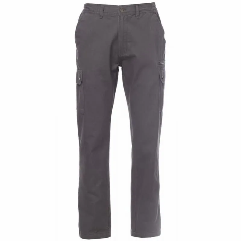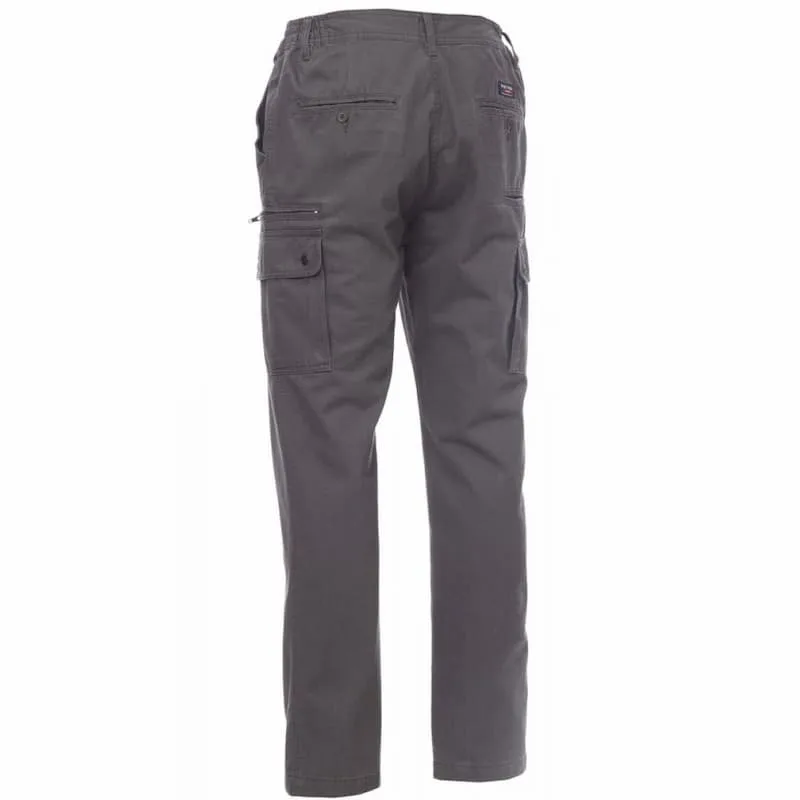 Fecho de correr com botão metálico, dois bolsos dianteiros, dois bolsos laterais com paleta e fechos tipo snap, um bolso de correr lateral, um bolso de fita métrica rebatível à direita, dois bolsos traseiros com ranhura, com casa e botão.