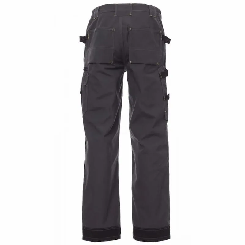 Fecho de correr com botão metálico, dois bolsos dianteiros no mesmo material que as calças, dois botões laterais multi-funções com suporte de crachá destacável, rebatível, um bolso de fecho de correr, dois bolsos frontais abertos, um suporte de martelo.