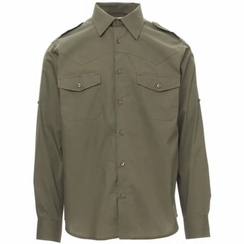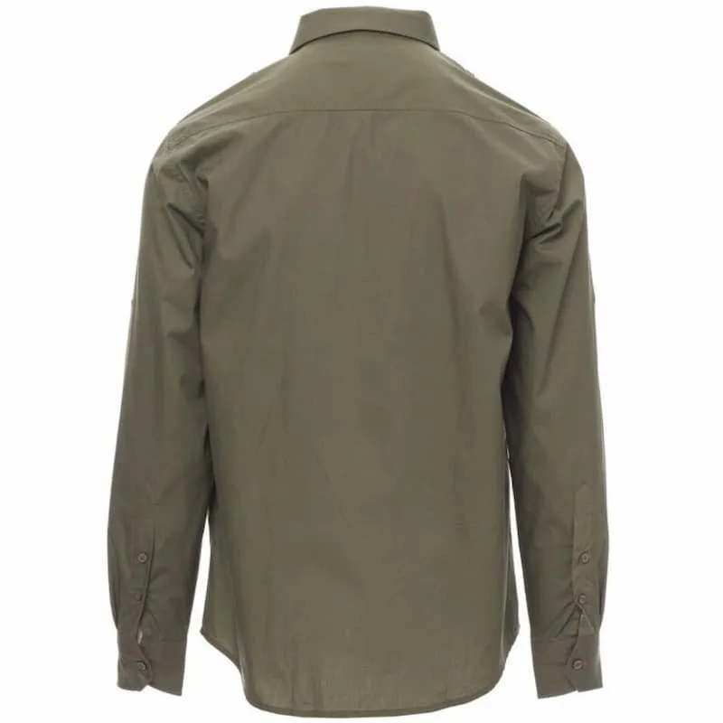 Camisa em algodão penteado de tecido fino de homem, ligeiramente ajustada, cabeção na frente, fecho com botões à cor e casas de botão em cor contrastante, almofadas nos ombros, dois bolsos no peito com paleta e casas para caneta, tira com botão no braço para enrolar de forma prática as mangas.