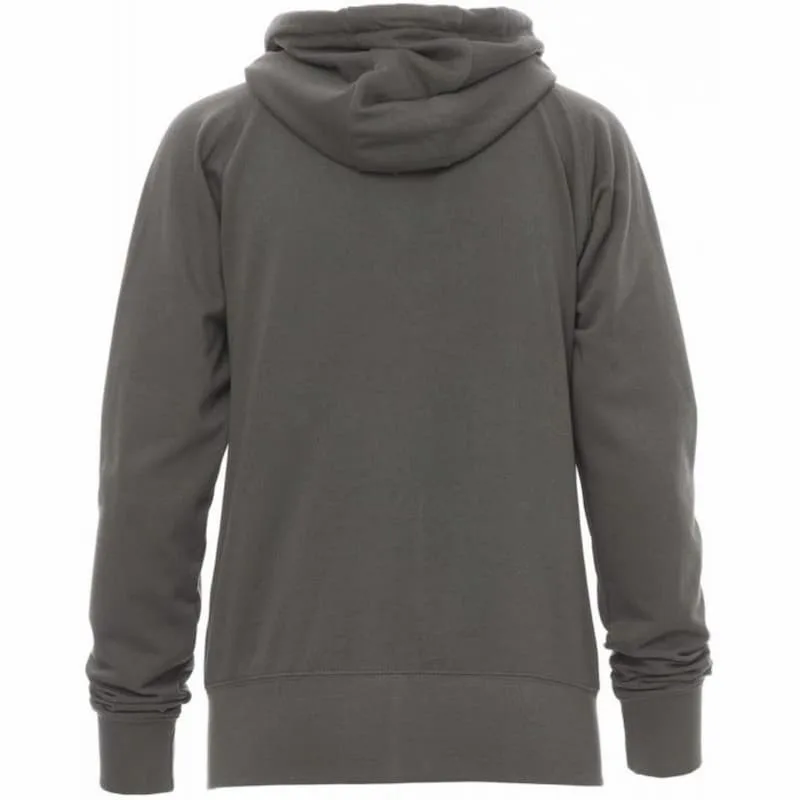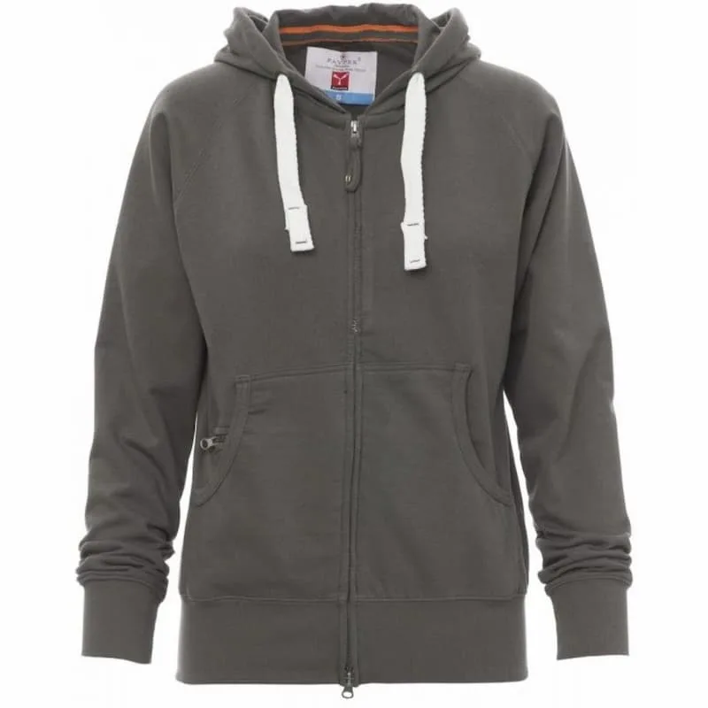 Camisola com capuz de mulher ajustada com fecho SBS coberto e completo, com cursor duplo, capuz com bainhas de ponto duplo e cordão branco com anéis metálicos e costura na cor da camisola, mangas em raglá, bolsos canguru, bolso de fecho pequeno, punhos e bainha de canelado elástico, costuras reforçadas.
