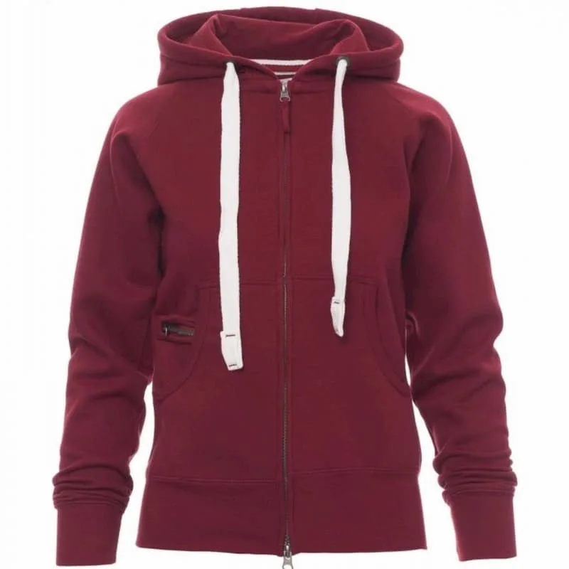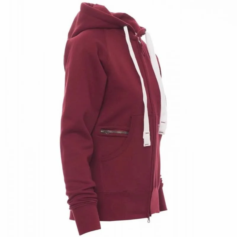 Camisola com capuz de mulher ajustada com fecho SBS coberto de plástico e completo, com cursor duplo, capuz com bainhas de ponto duplo e cordão branco com anéis metálicos e com costura na cor da camisola, mangas em raglá, bolsos canguru, bolso de fecho pequeno, punhos e bainha de canelado elástico, costuras reforçadas.