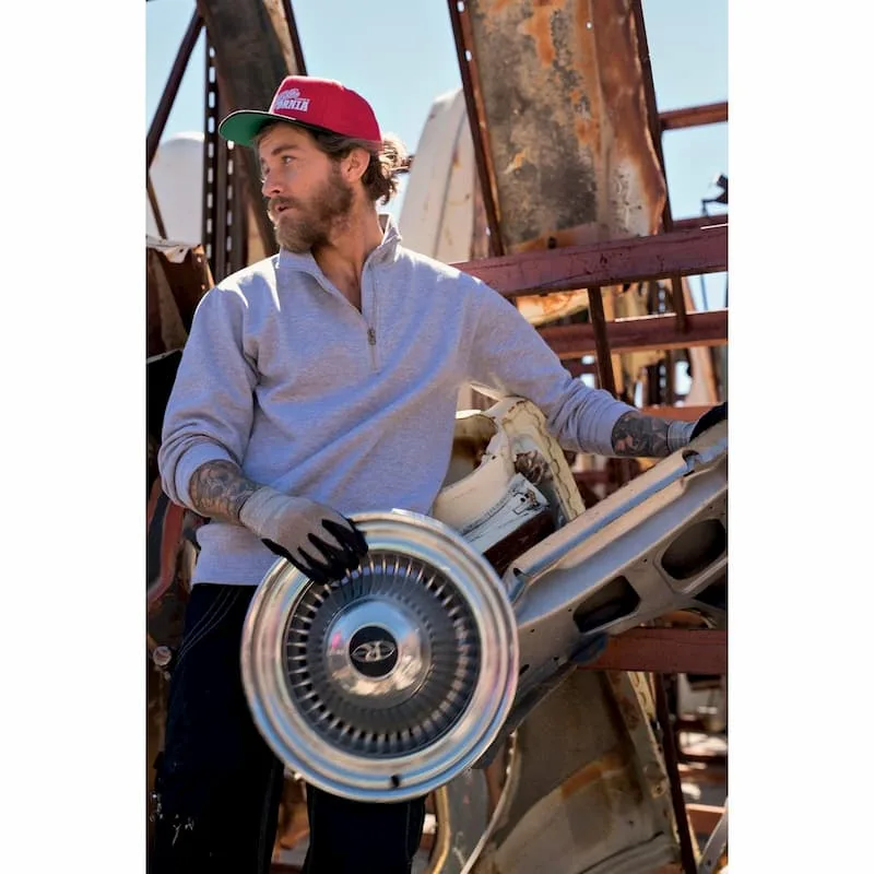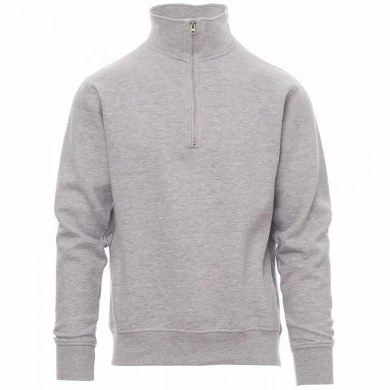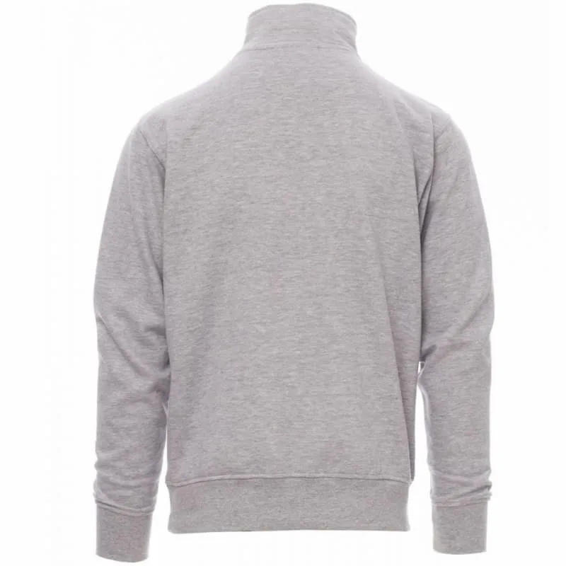 Camisola de homem, com meio fecho, de plástico com cursor em metal, manga na cava, punhos e cós de canelado elástico, costuras reforçadas.