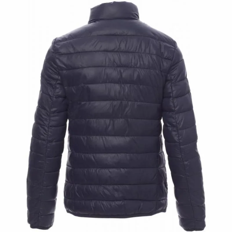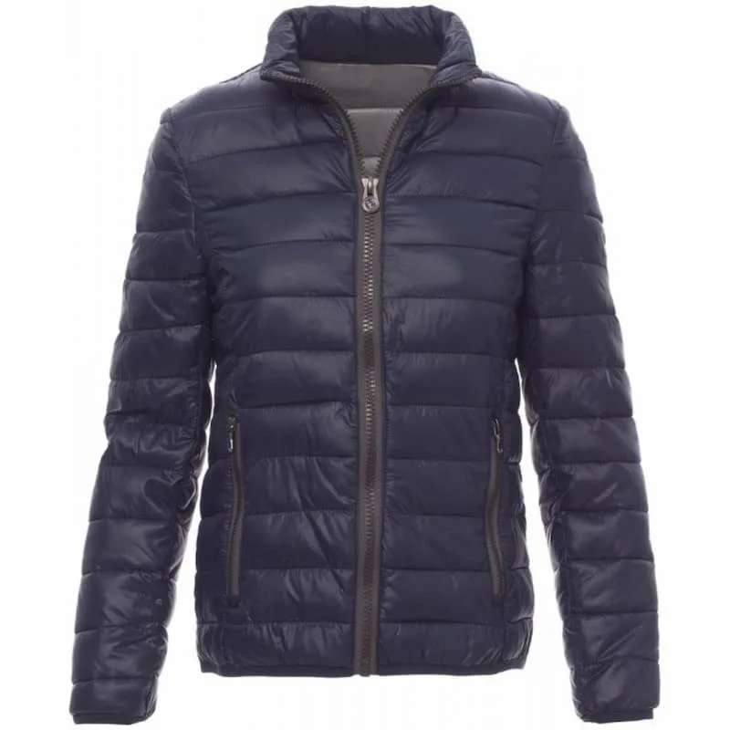 Casaco acolchoado de mulher de ajuste confortável com fecho de correr de plástico de 8 mm com cursor metálico, punhos e bainha de extremidade dina, dois bolsos exteriores.