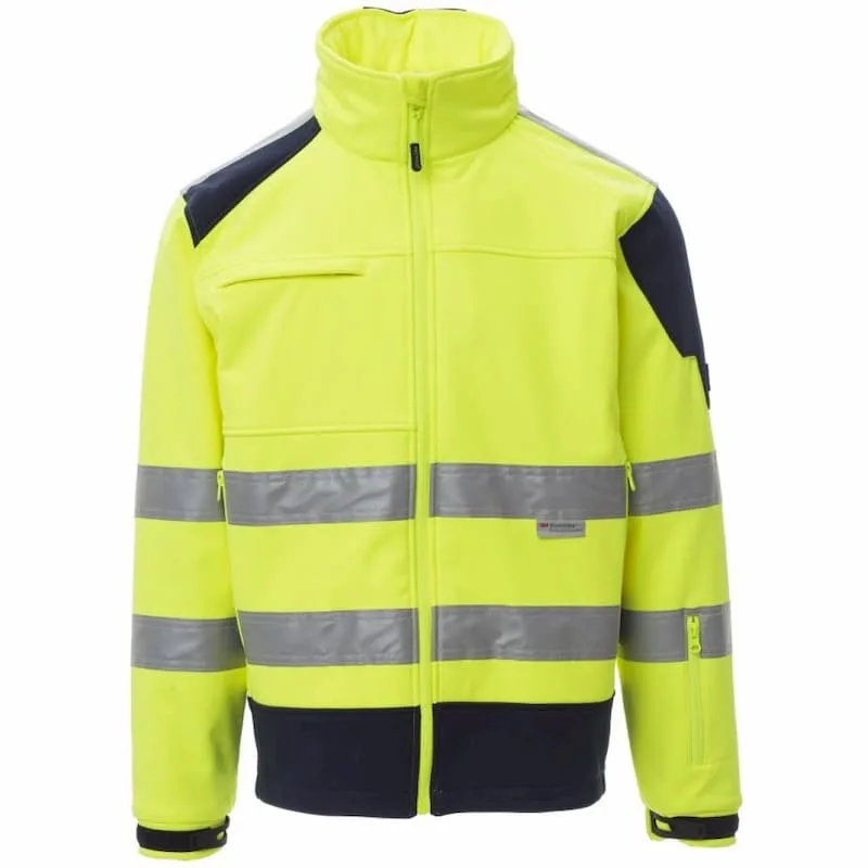 Casaco de ajuste ergonômico, de alta visibilidade, bicolor, de homem com faixas 3M, fecho de correr SBS de tira comprido, punhos ajustáveis com fecho Velcro, capuz oculto na gola, dois bolsos laterais com fecho de correr, um bolso de peito, porta-identificação destacável e rebatível, um bolso no braço esquerdo.