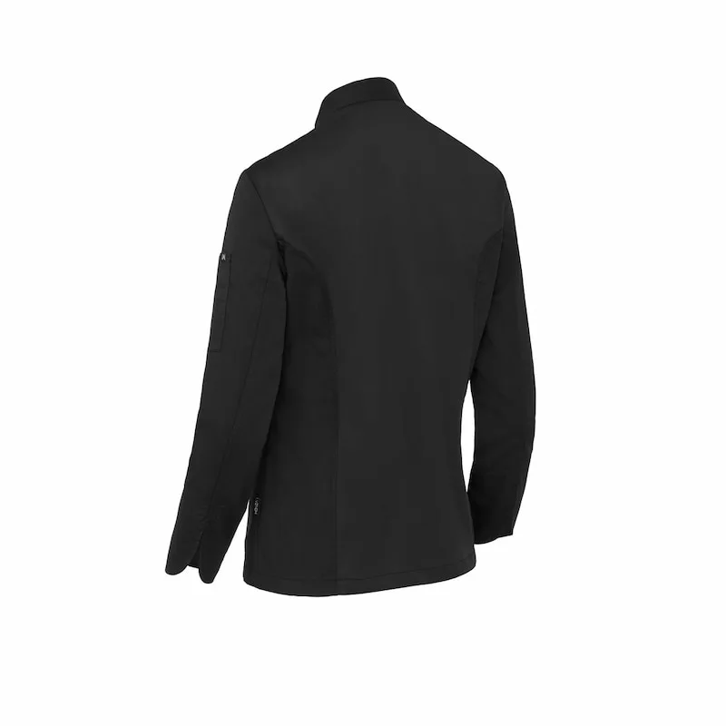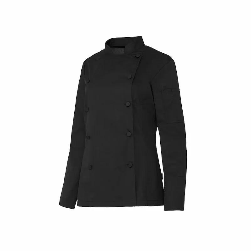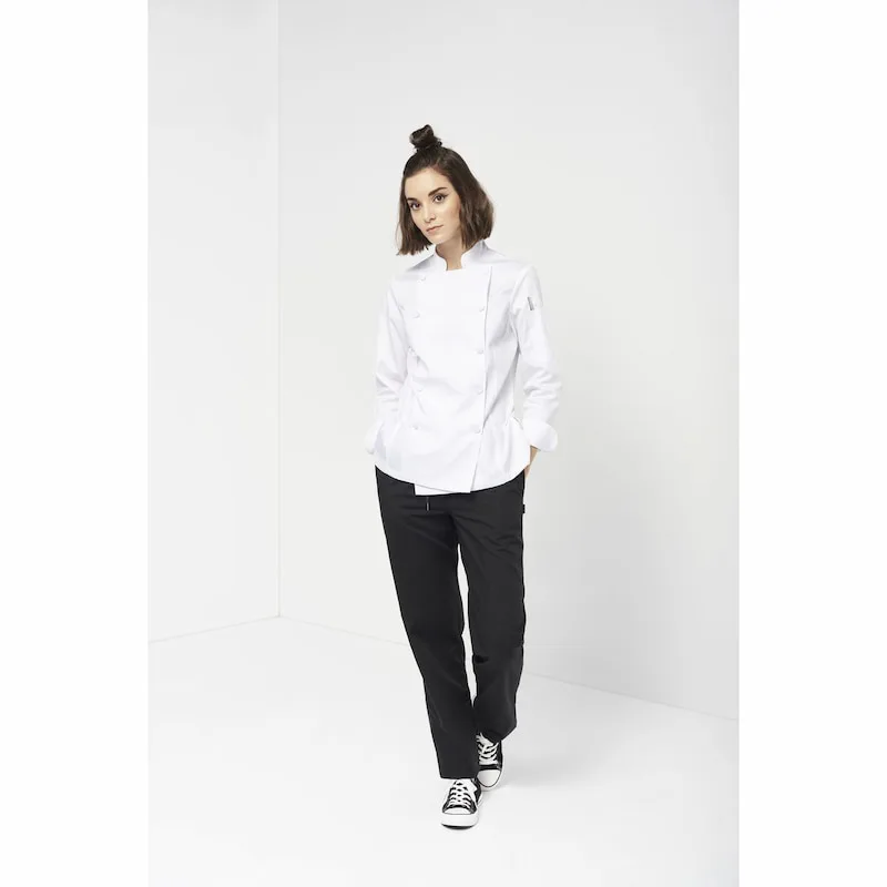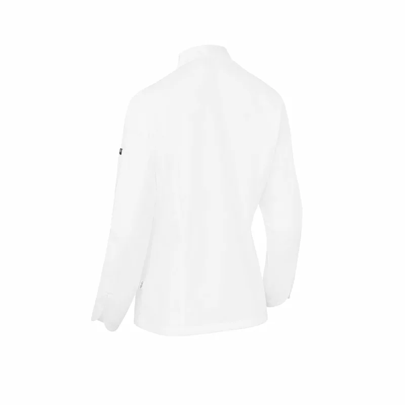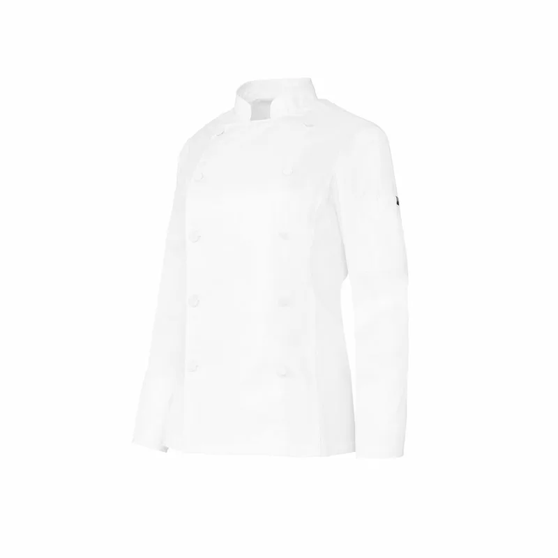 Casaco de cozinha mulher com botão forrado Regular Fit. Fecho trespassado e botão forrado. Gola e manga em mandarim com punho tradicional.