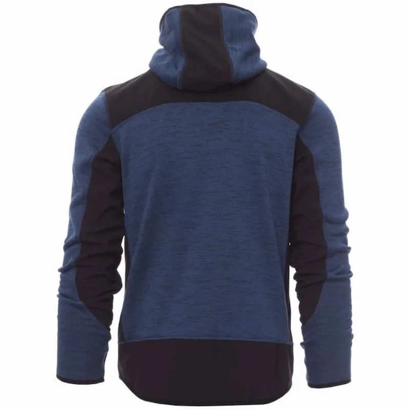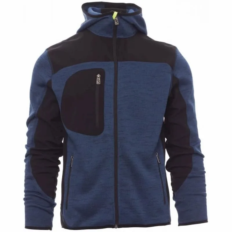 Casaco de ajuste confortável de homem, fecho de correr SBS de tira comprido, capuz com costuras de ponto duplo, punhos e bainha de borda fina, dois bolsos laterais com fecho de correr, um bolso de lapela. Detalhes de malha com inserções em softshell preto.