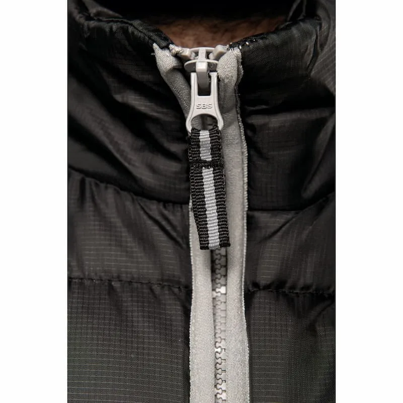Fecho em contraste cinzento e faixa em contraste cinzenta na zona frontal, nos bolsos e no cós.