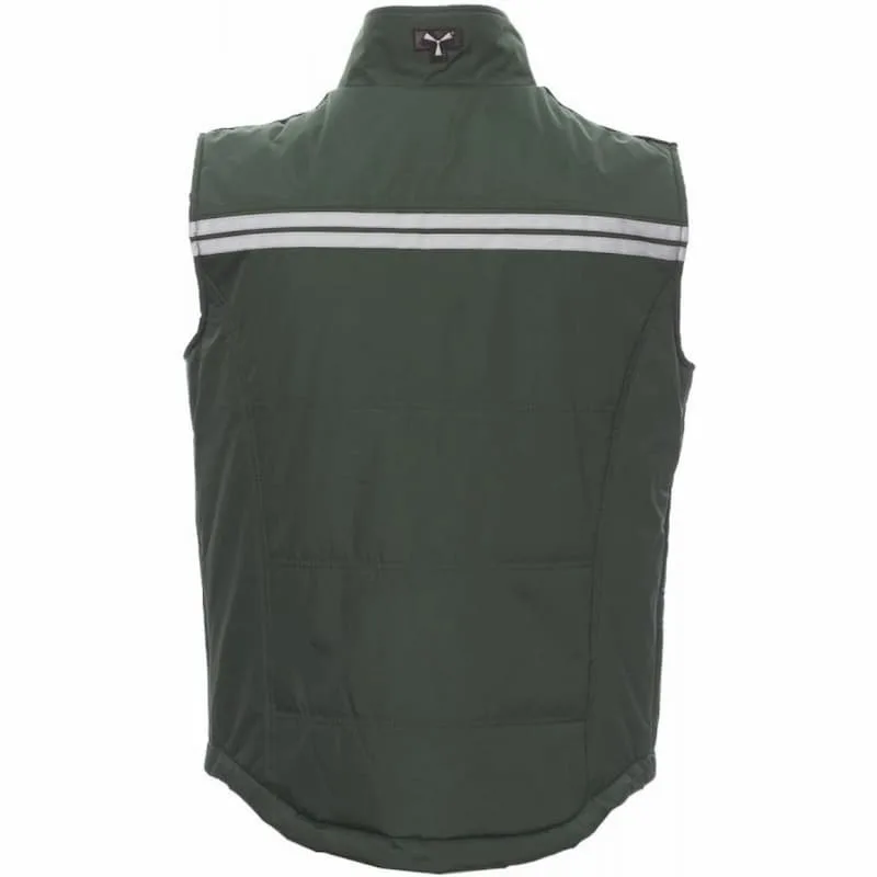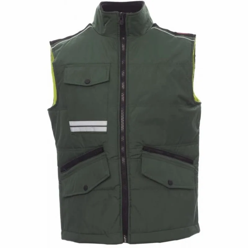 Colete unissexo, fecho de correr de 8 mm em plástico e com cursor de metal, com paleta e botões em plástico, costas contornadas, bolsos exteriores LOCK SYSTEM e dois fechos de correr, bolsos inclinados para acesso fácil, um bolso no peito para smartphone e anilha para prender o porta-identificação, faixas refletoras no bolso e nas costas.