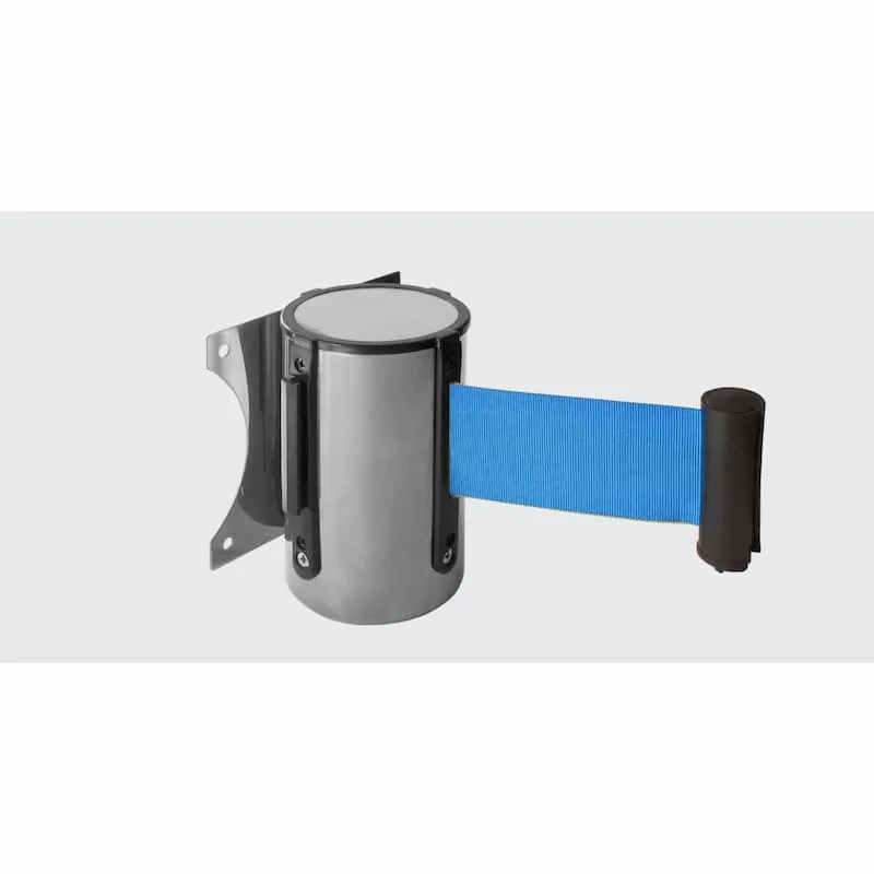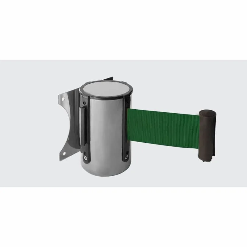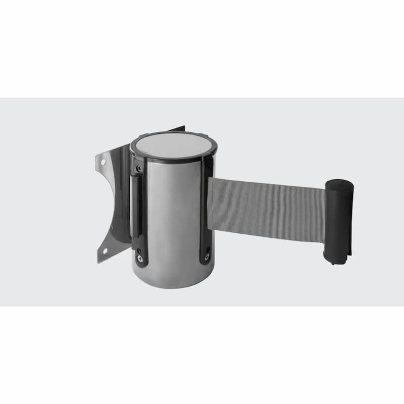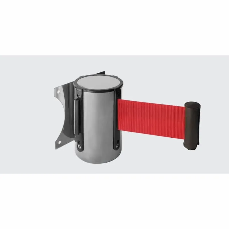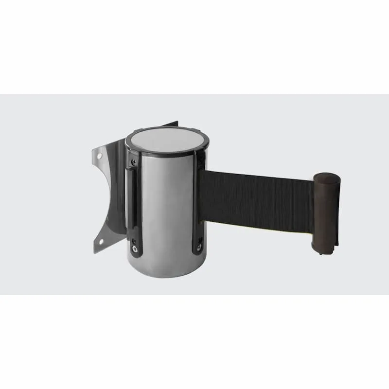Enrolador de parede em aço inoxidável cromado, com fita, para união às barreiras de delimitação de 1 fita, 2 fitas e de 1 fita com base de encaixe. Poderá funcionar sem barreira de delimitação, em aplicações mais estreitas, de parede a parede (ex: corredores), devendo nesse caso ser aplicado o suporte de parede em plástico, para encaixe da fita retráctil.