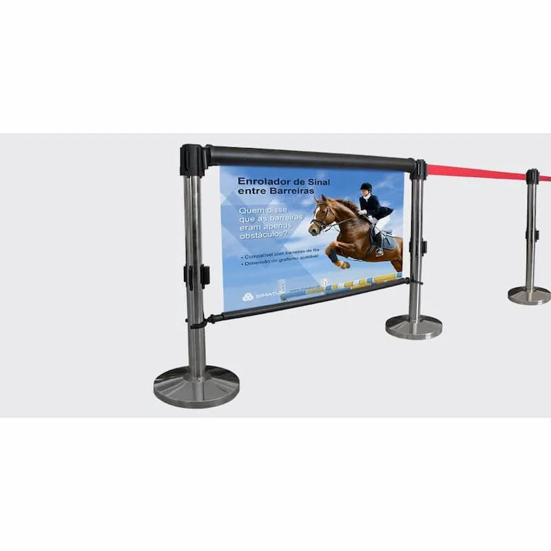 Kit de substituição do sinal ajustável entre barreiras, composto pela tira-superior (plástico) de suporte ao grafismo e encaixe no enrolador e tira-inferior (plástico), também para fixação do grafismo à barra metálica inferior.