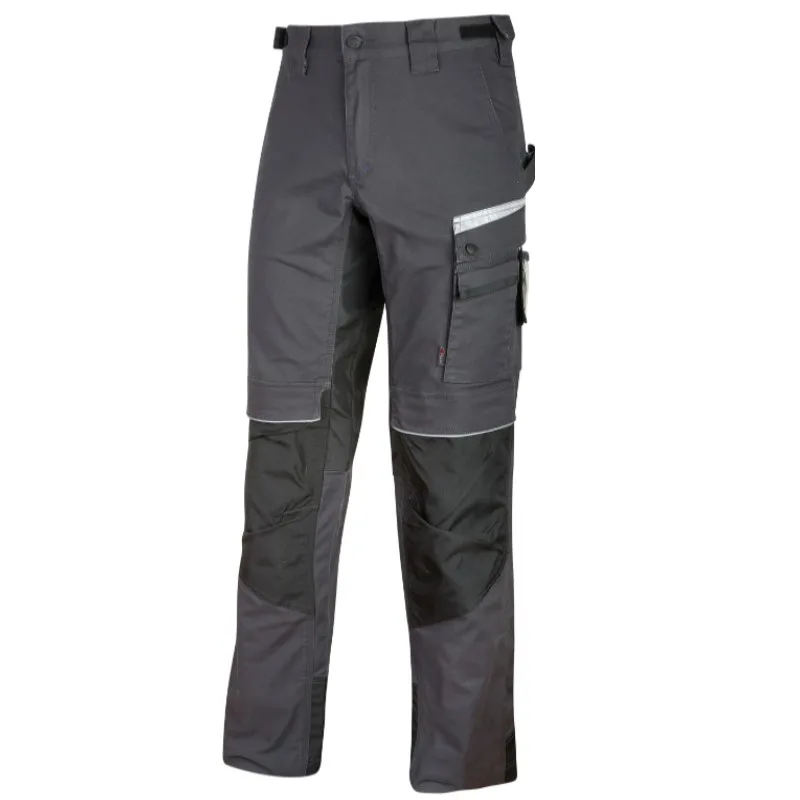 Calça Workwear TC com 2 bolsos frontais grandes, bolso lateral com inserções para ferramentas polyoxford 300D, bolso lateral multifuncional com porta-crachá retrátil, 2 bolsos traseiros livres com fecho de segurança com velcro, 2 bolsos no joelho com abertura superior e tecido interno elástico para máximo conforto. Loop de martelo ajustável. Inserções reforçadas em tecido polyoxford 300D duplo em áreas de alto contato. FLEXBAND ajustando conforme necessário; um sistema de cós inovador, retrátil e elástico. Inserções reflexivas para maior visibilidade. Costura tripla, botão à prova de riscos, fecho de correr YKK. Calças para carpinteiros, eletricistas, encanadores, instaladores, mecânicos.