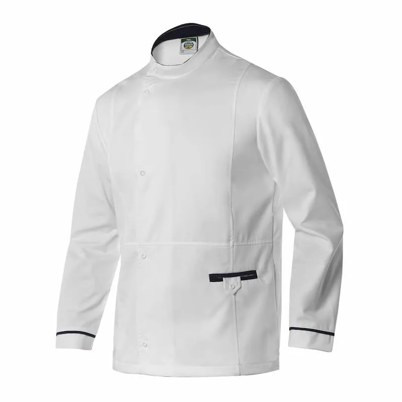 Casaco masculino de manga comprida com gola, bolsa larga com botão e abertura lateral direita.