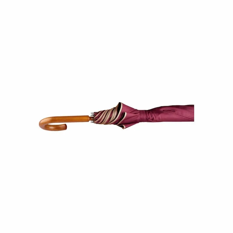 Chapéu de chuva clássico com 23″ (58.5cm), abertura automática, tecido 100% poliéster pongee, cabo de madeira, varetas em metal, pega curva de madeira, pontinhas metálicas.