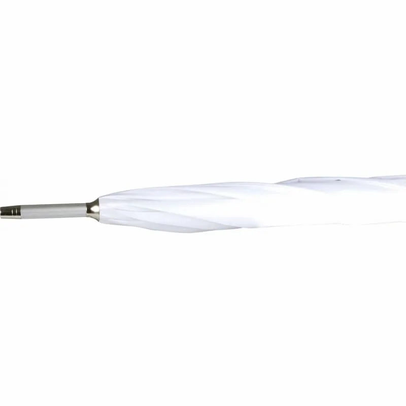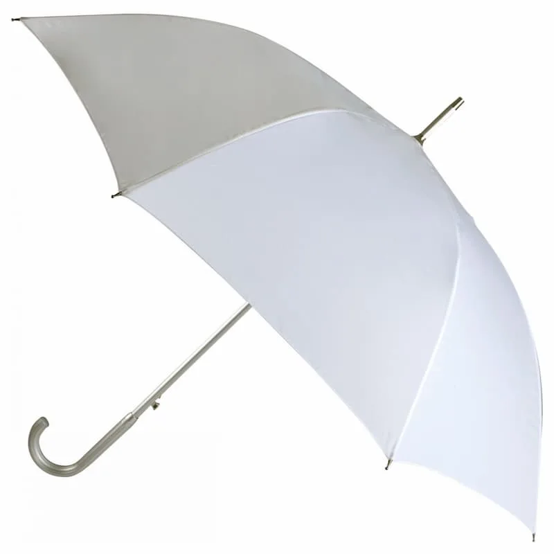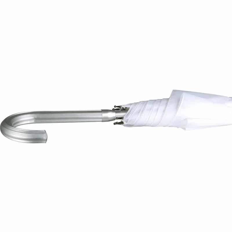 Chapéu de chuva em alumínio com 25″ (64cm), abertura automática, cabo em alumínio, varetas em alumínio e fibra de vidro, cabo curvo, tecido em 210T poliéster, pontinhas metálicas.