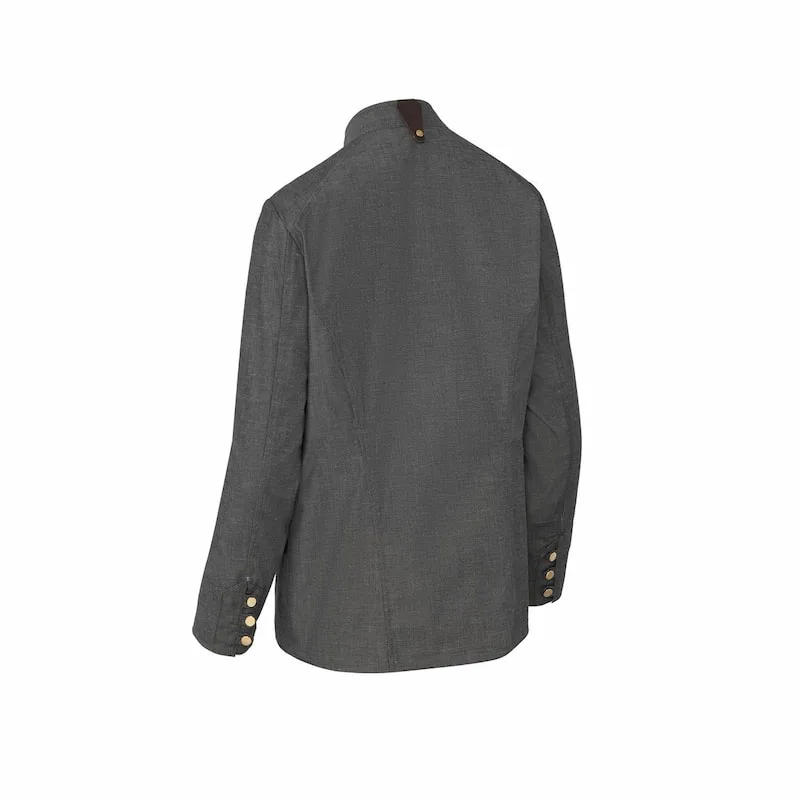O fechamento lateral com um fecho oculto de liberação rápida e fivelas de ouro visíveis dão um toque de elegância. Os punhos largos fecham-se com 3 botões dourados para que possam ser enrolados se necessário. Um bolso no peito integrado nos recortes para que fique desfocado, conseguindo assim uma imagem impecável.