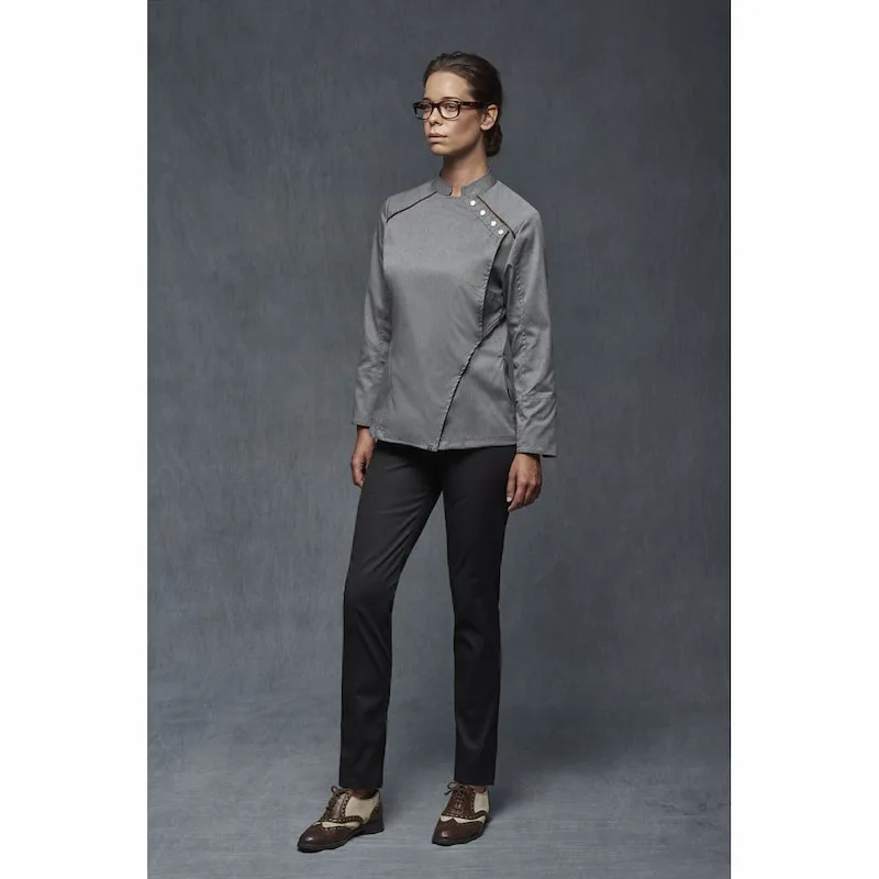 Jaleca de cozinha de senhora com ajuste fino. Com recortes arredondados na frente para realçar a silhueta.