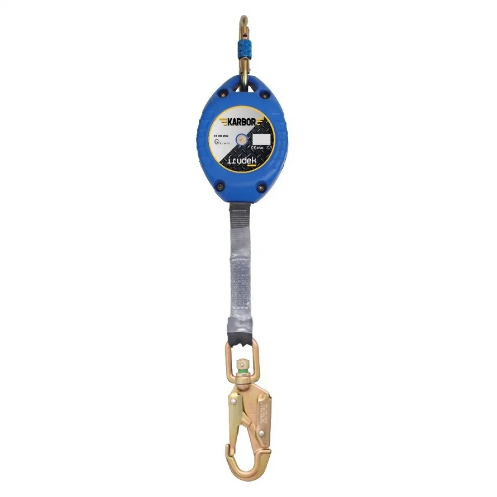 – Mosquetão inferior giratório de aço com indicador de queda.