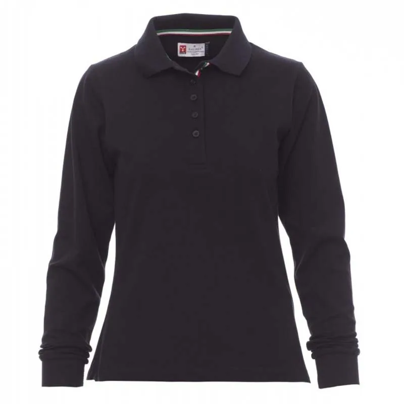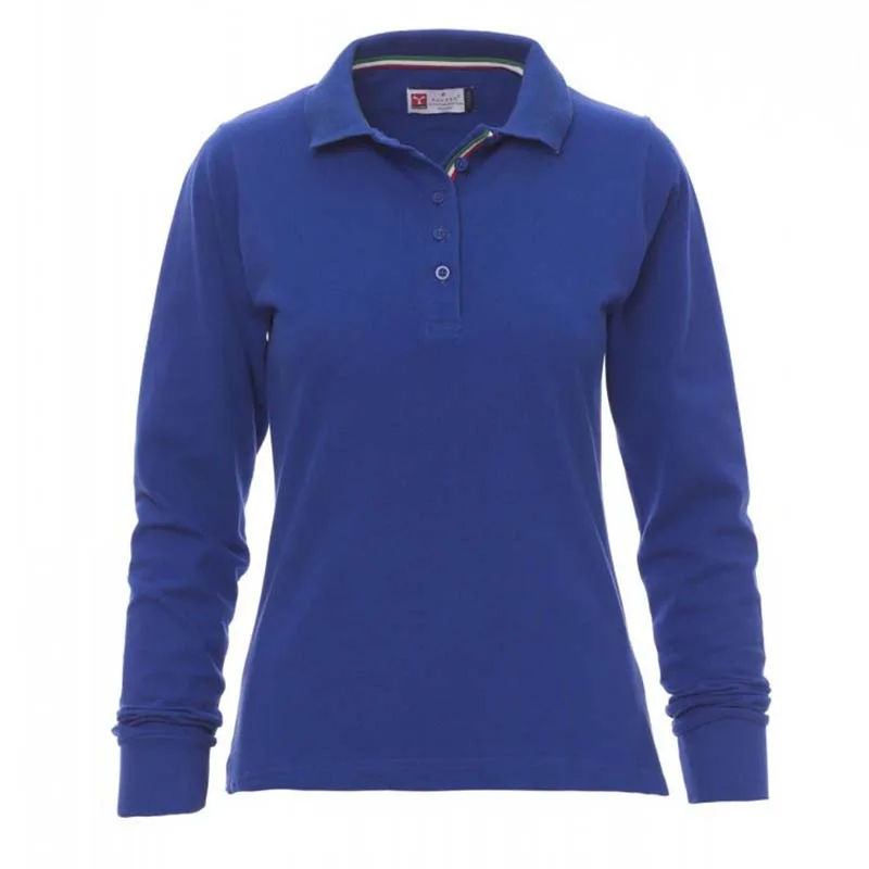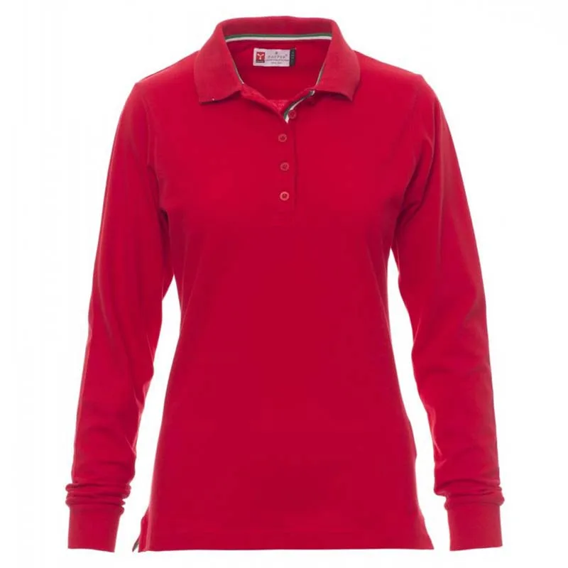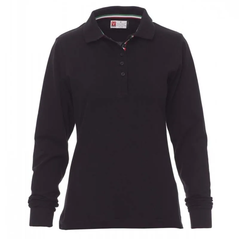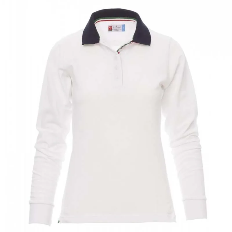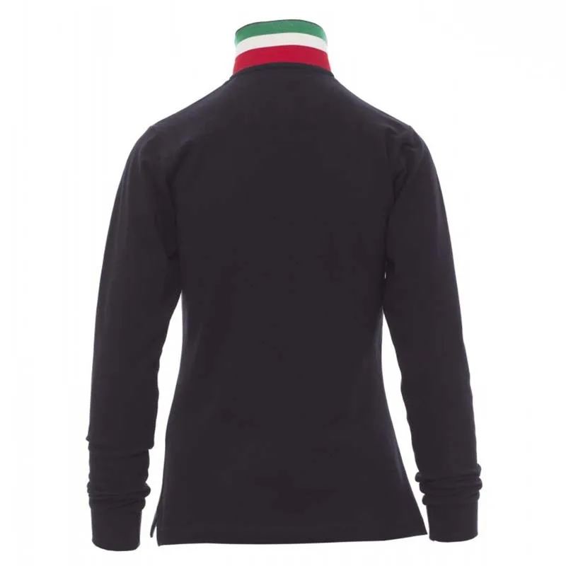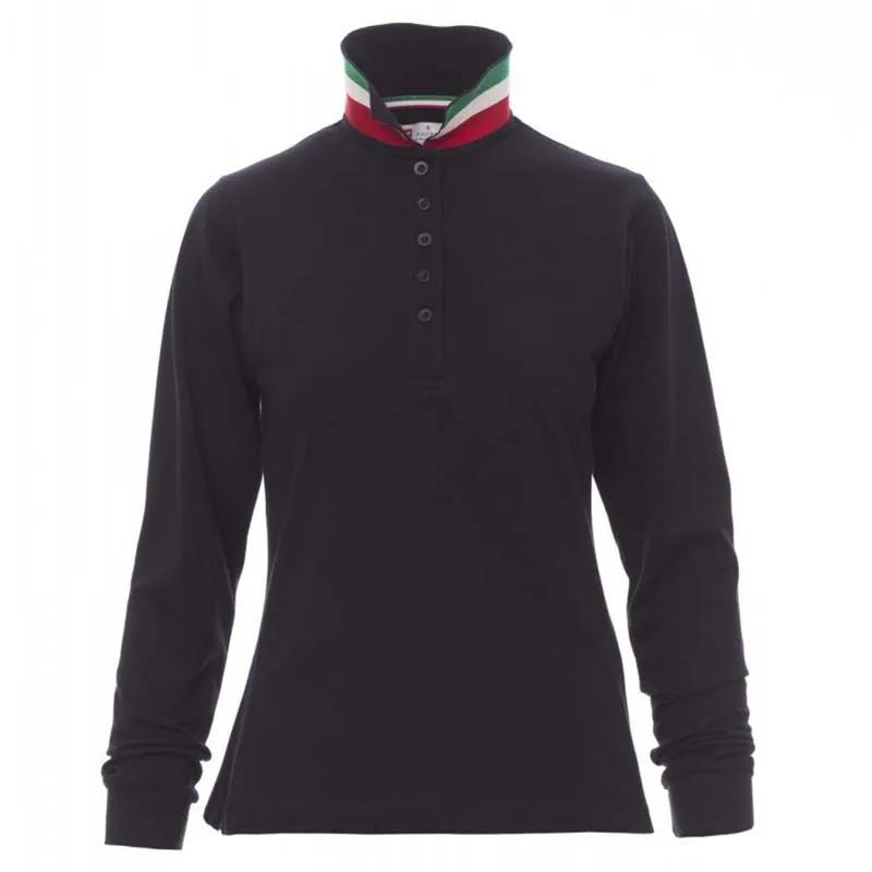 Camisa polo de manga comprida de mulher cintada com 5 botões iguais com efeito madrepérola, colarinho à cor com parte inferior contrastante (cores da bandeira). Aba de botão interior e respiradouros laterais com a cor da bandeira, punhos e colarinho de canelado, costura do colarinho oculta, tira de reforço lateral.