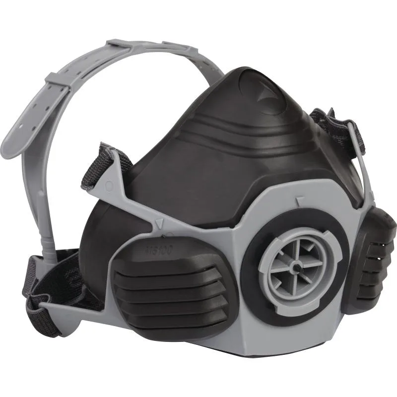 Meia máscara conforto, 3 componentes : corpo da máscara em termoplástico elastômero (TPE) – Suporte de ancoragem dos cartuchos em polietileno HD (HDPE) – Cárter de proteção da válvula em polipropileno (PP).