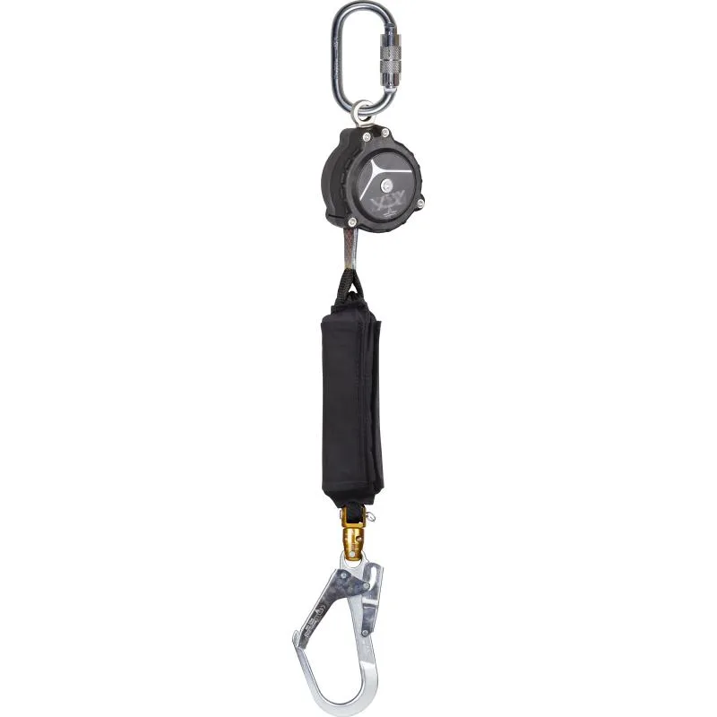 Anti-queda com curso de retorno automático em correia de 19,5 mm com dissipador de energia. Cárter em poliamida. 2 suportes giratórios com indicador de queda. 1 conector amovível. 1 gancho de alumínio, abertura de 51 mm.