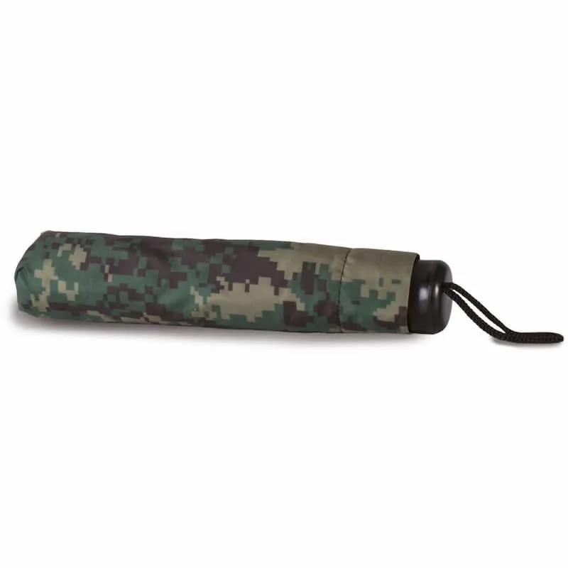 Mini chapéu de chuva com 21″ (54cm), 3 secções ,abertura manual, cabo metálico, varetas em fibra de vidro, tecido em 100% poliéster pongé, pega em plástico, pontinhas metálicas.