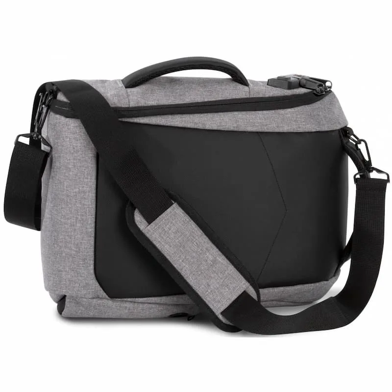 1 bolso lateral com cabo anti-roubo em espiral para prender o saco ao pé de uma mesa ou cadeira.