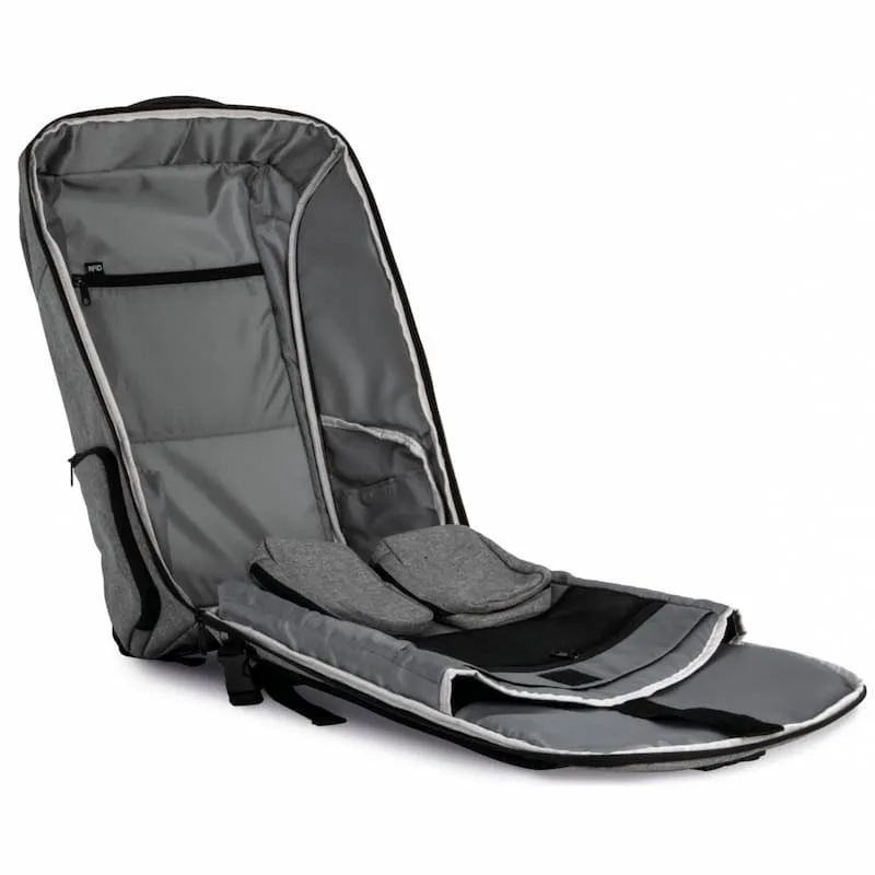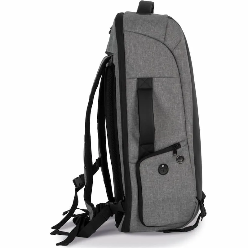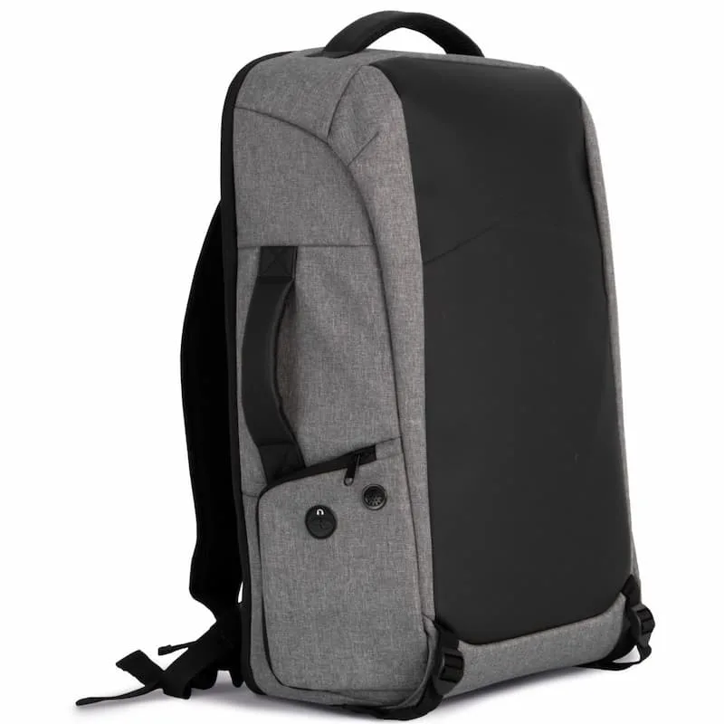 Particularidades: fecho de correr anti-roubo com sistema TSA por código; bolso lateral com cabo anti-roubo; bolso interior com proteção RFID; reforços acolchoados na parte traseira; alça de peito regulável; duas fivelas para fixação no saco; dois bolsos laterais; um bolso de carregamento lateral com porta USB e micro-USB; dois bolsos com fecho nas alças; uma alça a tiracolo acolchoada amovível; um compartimento interior para computador e tablet; um bolso em rede e dois bolsos com fecho amovíveis para cabos e acessórios.