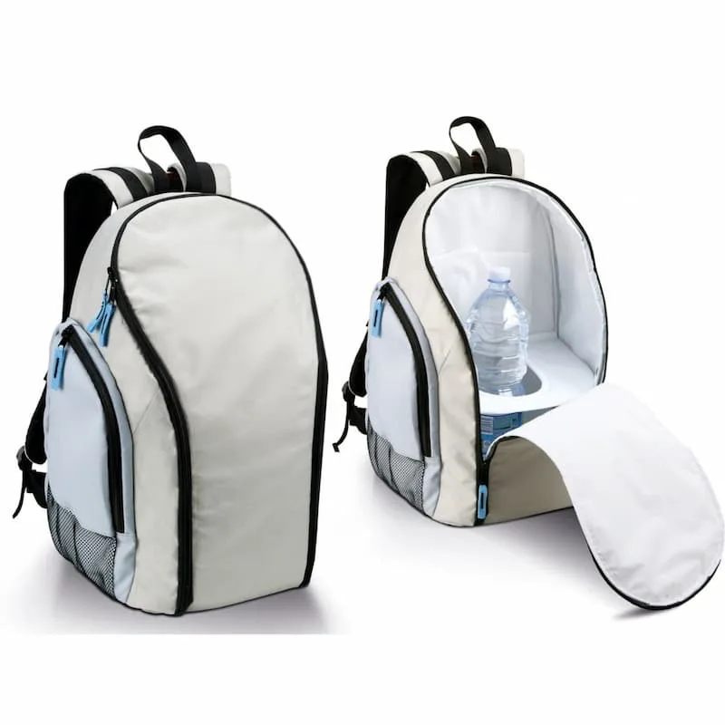 Cinto e alças acolchoadas, bolso lateral com fecho e bolso lateral em malha.