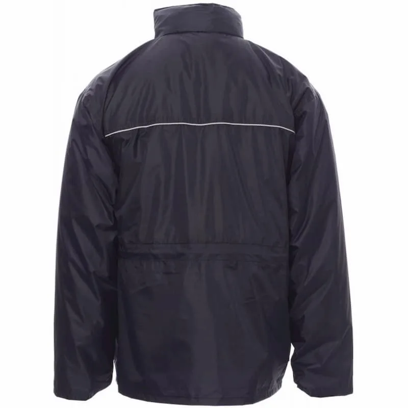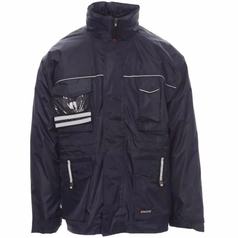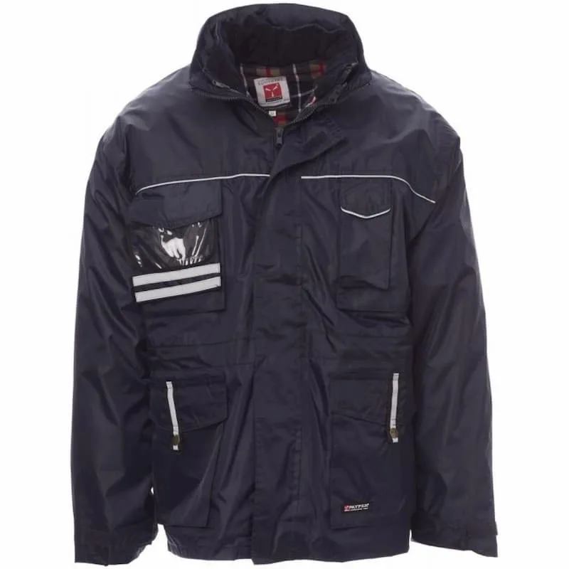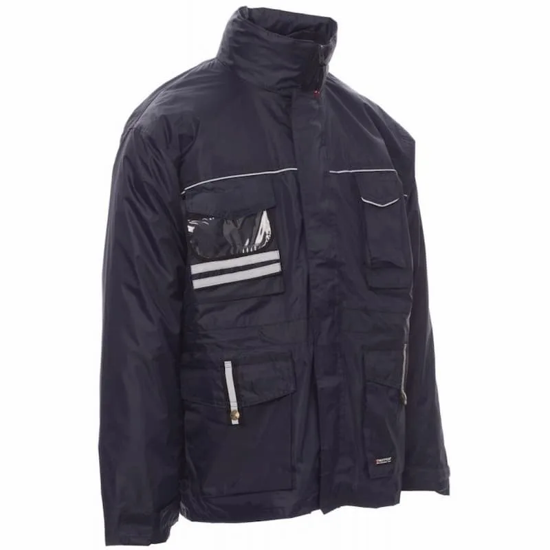 Parka tripla função, composta por: casaco exterior não acolchoado, com aplicações refletoras na parte frontal e traseira, capuz oculto na gola, quatro bolsos, dos quais um com porta-identificação reversível e porta-telemóvel, casaco interior destacável em husky acolchoado, com dois bolsos, mangas destacáveis, interior forrado em tecido escocês.