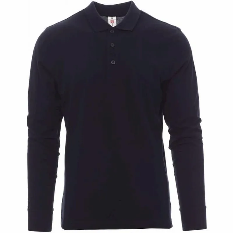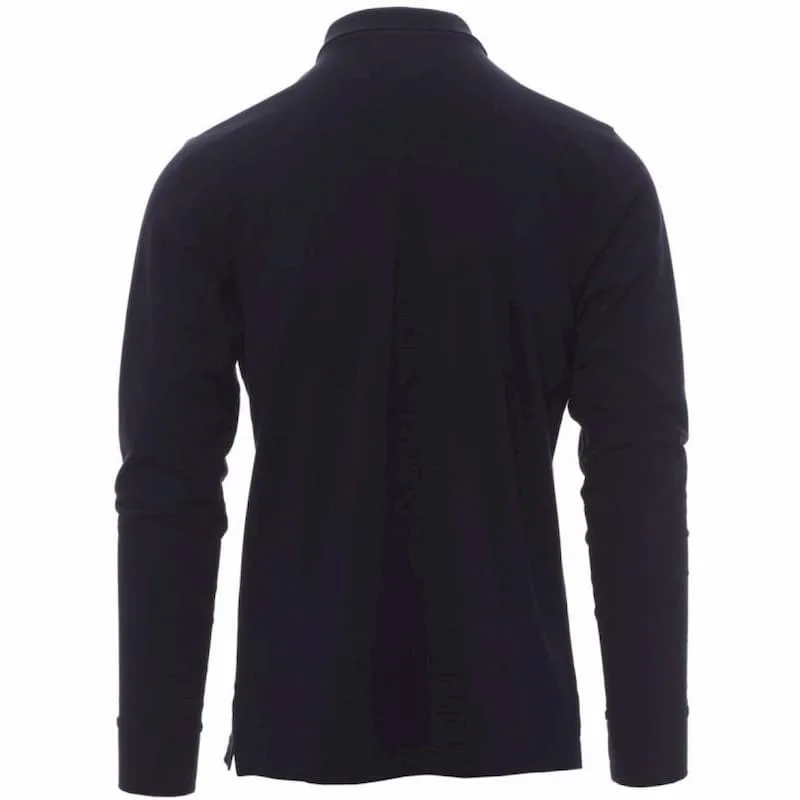 Camisa polo de homem de manga comprida com 3 botões na mesma cor, nacarados, gola e punho em canelado (rib), aberturas laterais, costuras da gola cobertas com fita na mesma cor, costuras stretch, fita de reforço lateral.