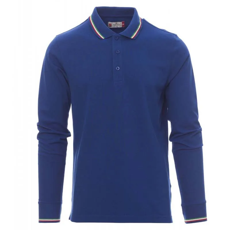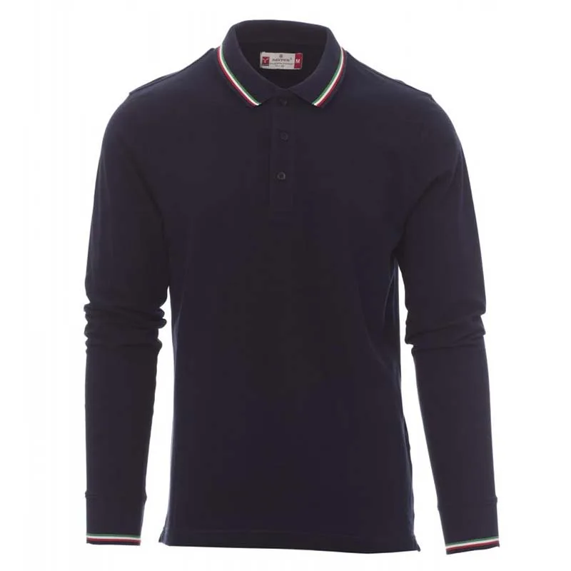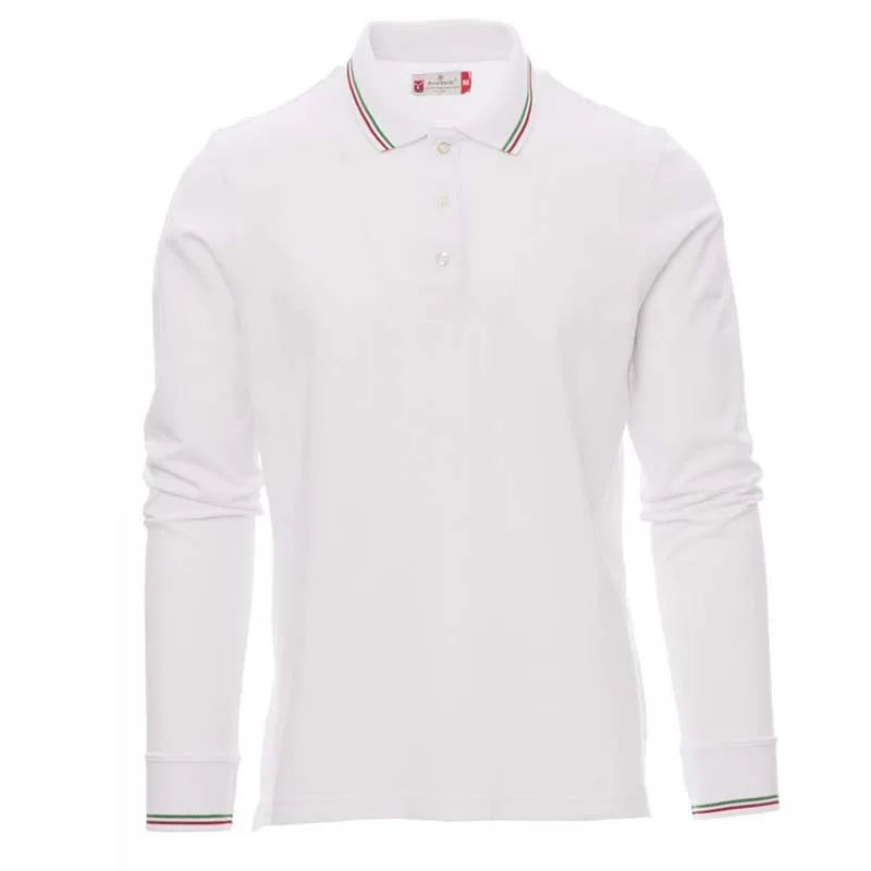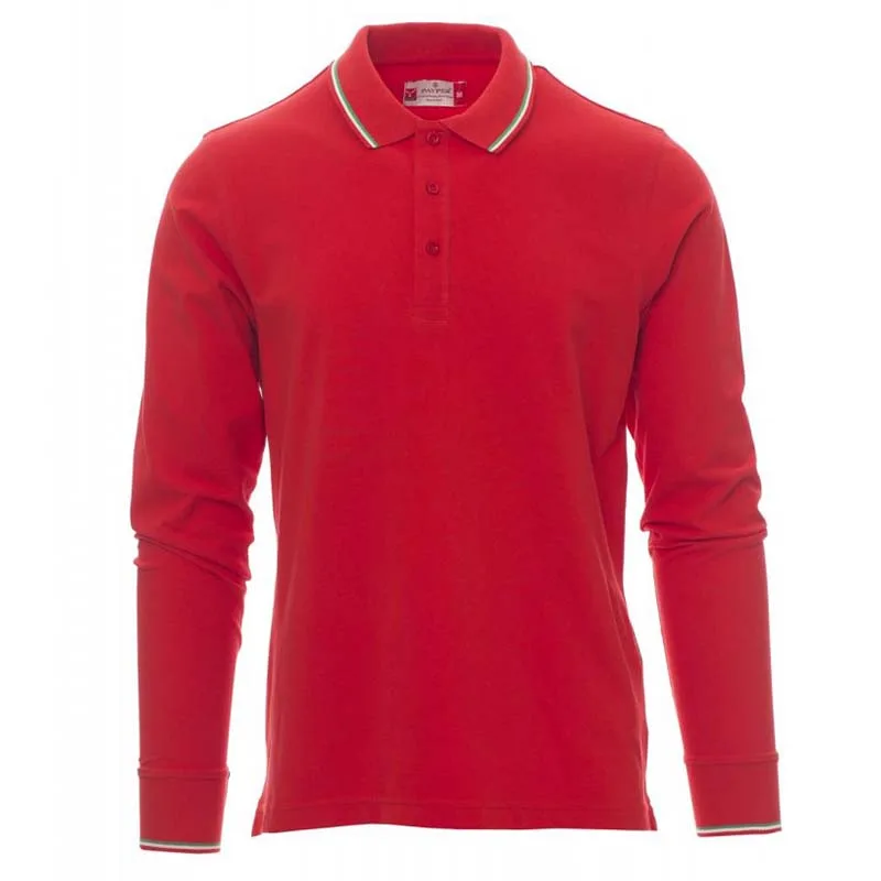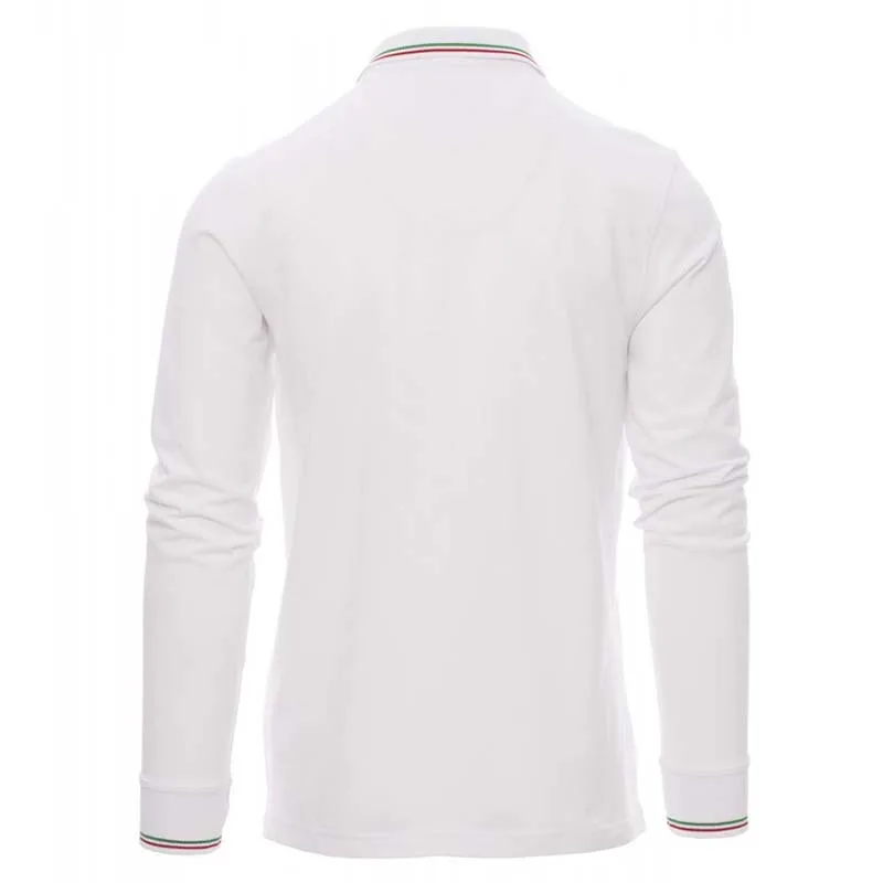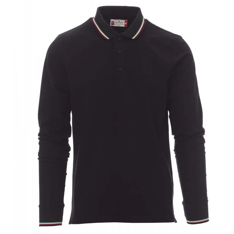 Polo de manga curta unissexo com 3 botões à cor, colarinho contrastante e adorno na manga (cores da bandeira), punhos e colarinho de canelado, respiradouros laterais, costura do colarinho oculta, tira de reforço lateral, tira de gola interior.
