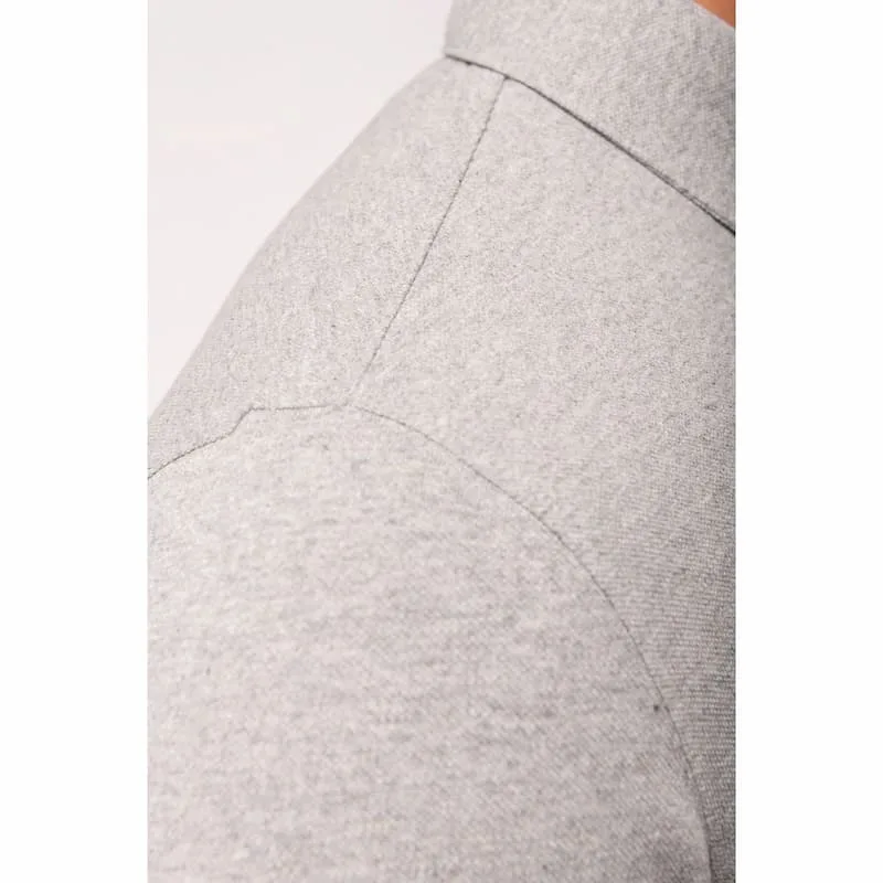 Corte direito. Etiqueta de tamanho com logótipo de algodão reciclado e poliéster reciclado. Carcela com 2 botões + 1 botão na base do colarinho com casa na horizontal, colarinho e base do colarinho fabricados no material principal.
