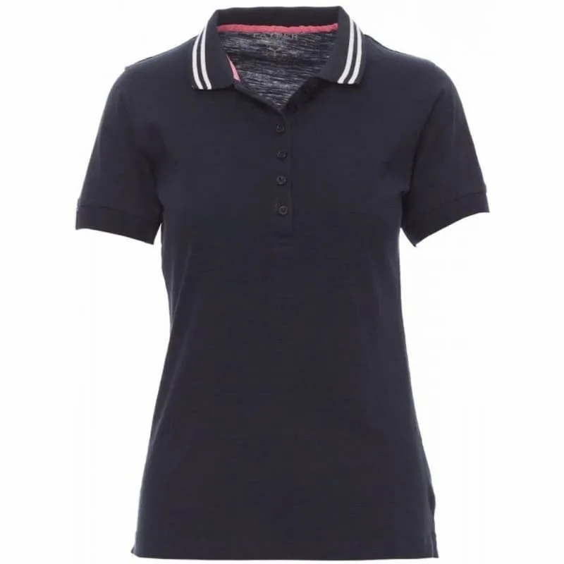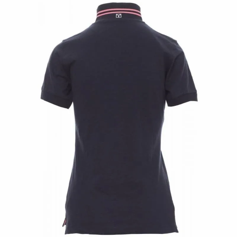 Camisa polo de manga curta cintada de mulher com 6 botões efeito madrepérola iguais, colarinho com riscas contrastantes e riscas fluorescentes na parte inferior, borda da manga e colarinho canelada, manga direita com inserção, respiradouros laterais e colarinho oculto cozidos com fita fluorescente, etiqueta de transferência.