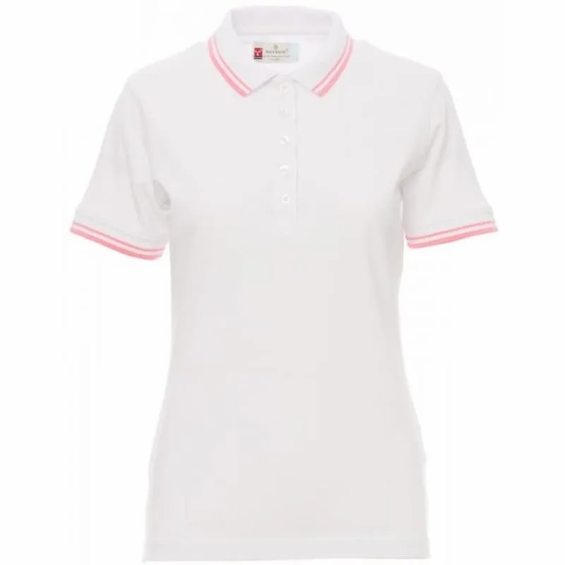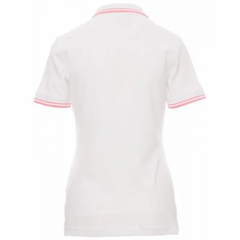 Camisa polo de manga curta de mulher cintada com 5 botões brancos, colarinho contrastante e adorno na manga, borda da manga e colarinho de canelado, respiradouros laterais com costuras reforçadas, costura do colarinho oculta, tira de reforço lateral, costuras elásticas, fita tapa-costura na gola.