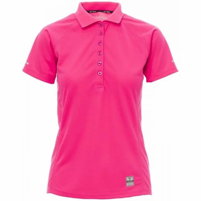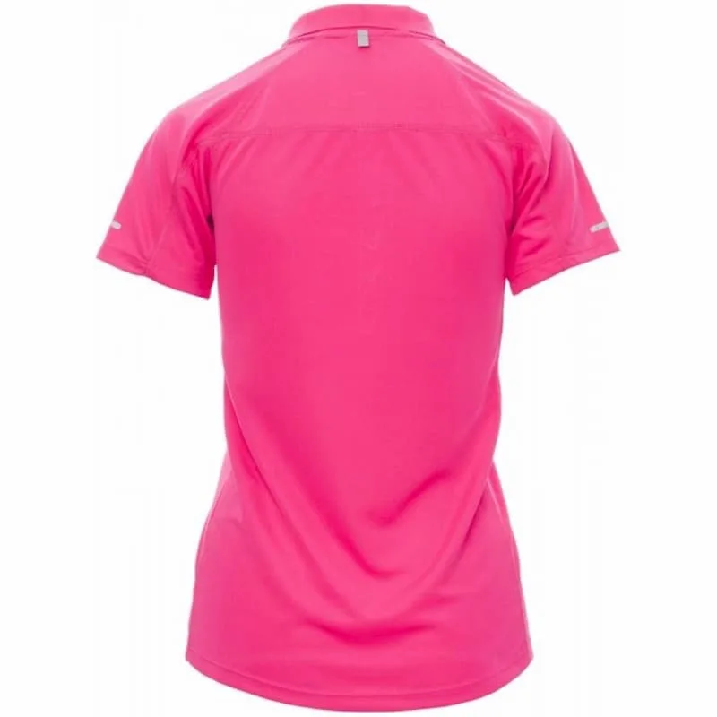 Camisa polo técnico-desportivo, cintado, de senhora, com mangas curta e de três botões, mangas reglã, costuras laterais duplas para um ajuste mais confortável, parte inferior ajustada e mais longa nas costas, aplicação refletora nas mangas e atrás da gola, com aba de proteção na gola em cor contrastante, etiqueta de transferência.