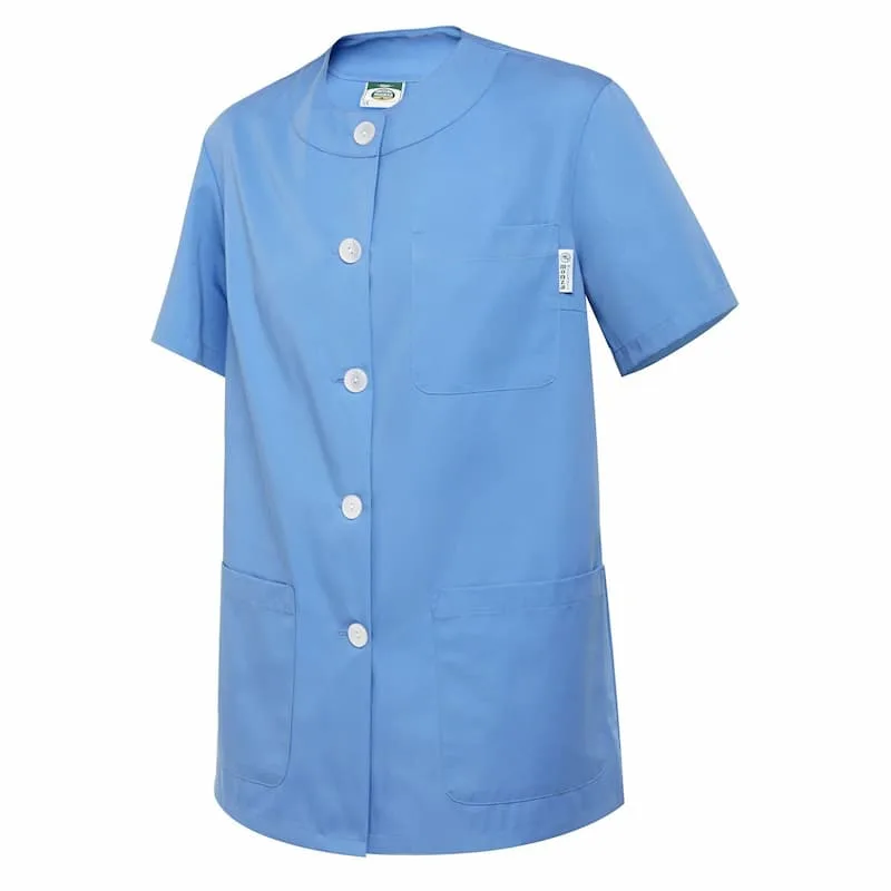 Casaco de senhora com decote redondo com abertura central e botões de manga curta.