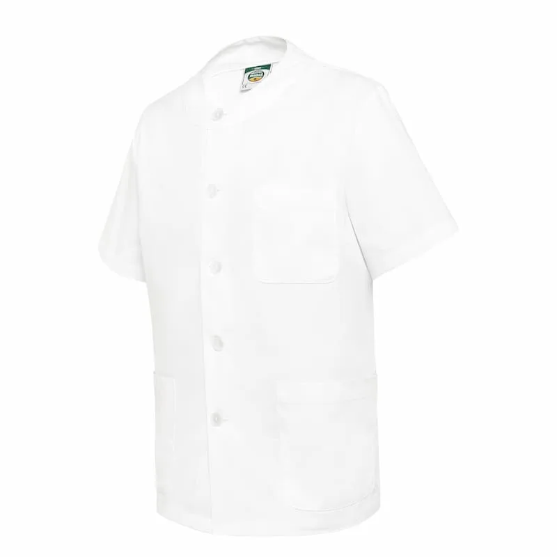 Casaco sanitário aberto com botões e pescoço redondo com mangas curtas anexadas.
